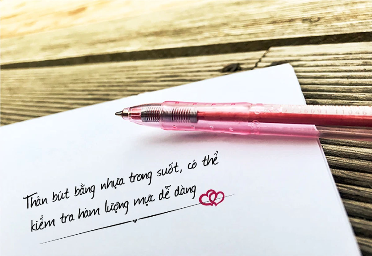 Bút có thiết kế ấn tượng. Toàn bộ thân bút làm từ nhựa trong, phối hợp hoàn hảo với màu ruột bút bên trong. Đặc điểm: - Bút được thiết kế với đầu bút nhỏ