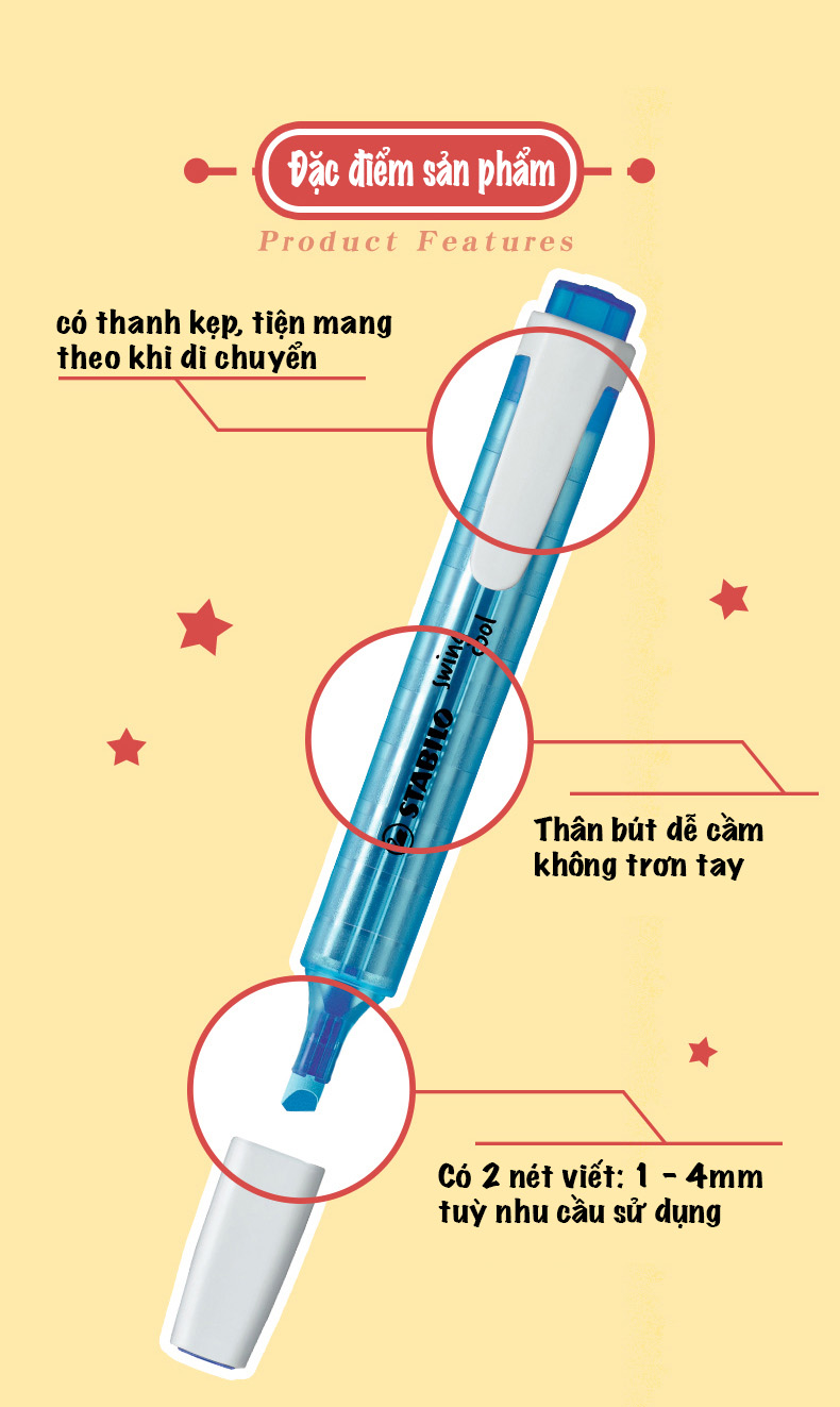 Màu mực tươi sáng hơn Không độc hại Thân bút màu dạ quang trong suốt Sử dụng được cho giấy thường và giấy fax Có thể đánh dấu với khoảng cách hơn 100 m++ Đầu