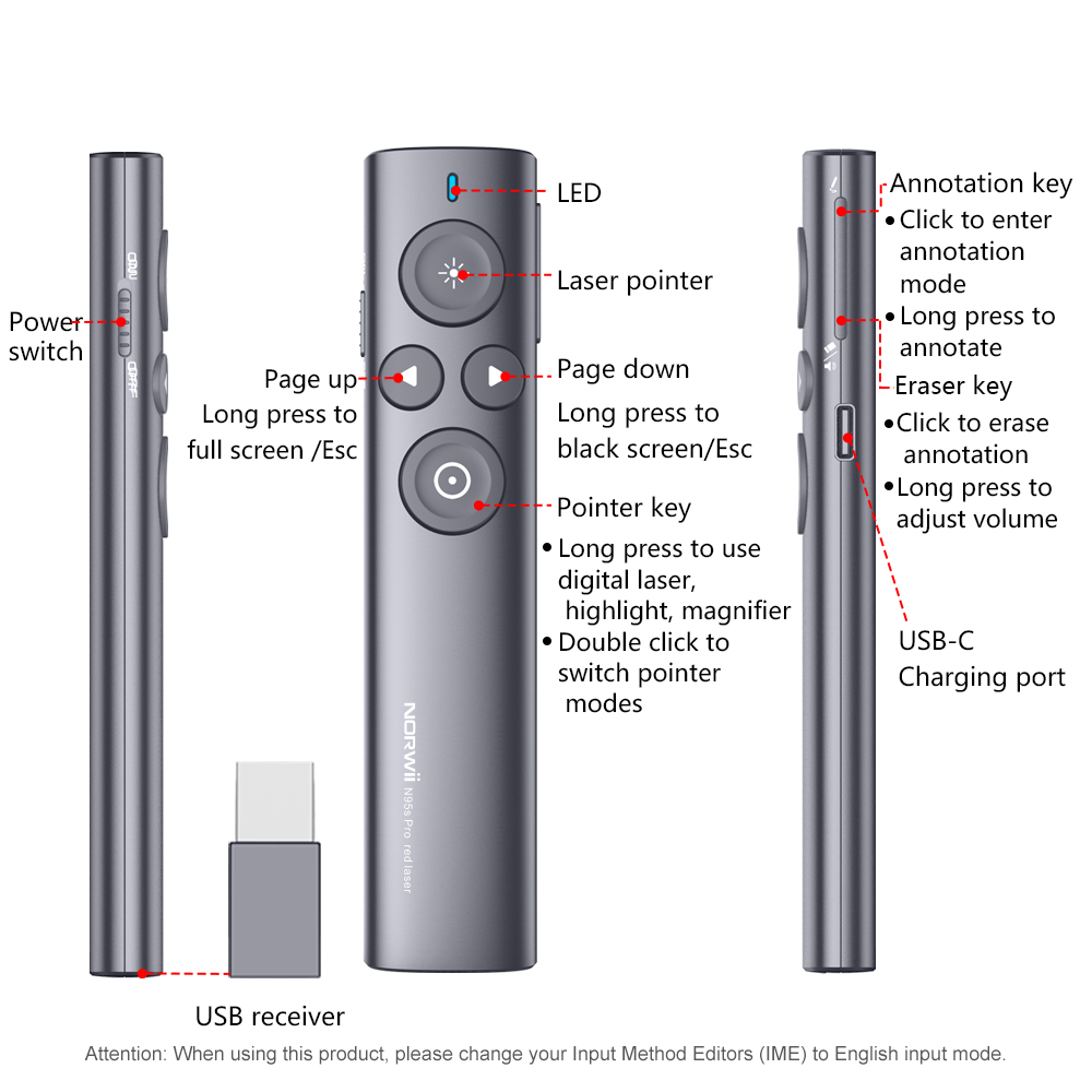Bút trình chiếu NORWii N95 Pro Spotlight cao cấp 2in1 Thông số kỹ thuật : Model : NORWii N95 Pro SPOTLIGHT Kết nối : 2.4GHz Đầu USB 2in1 :thu phát Wireless 2.4Ghz và USB dung