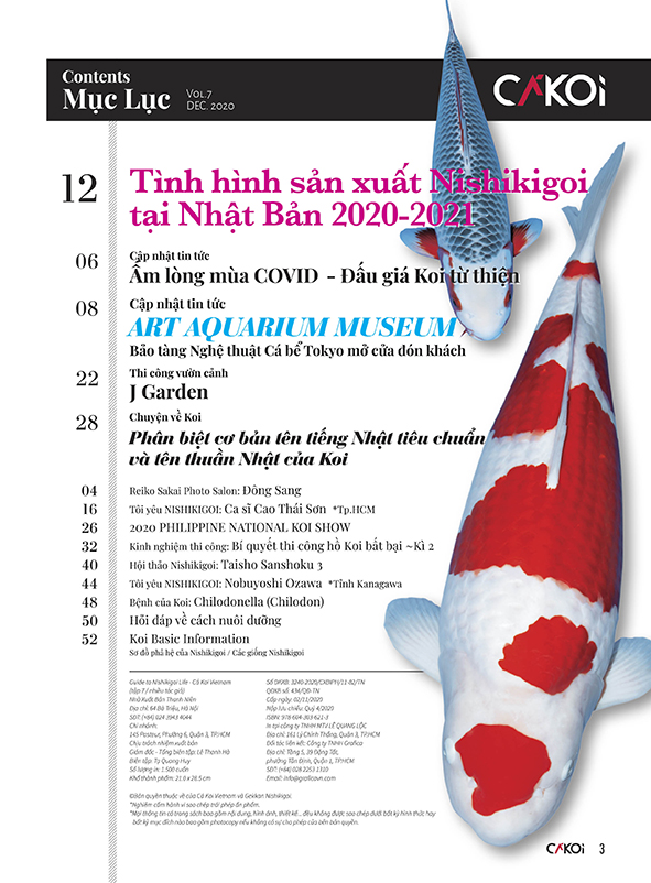 Cá Koi Vietnam – Guide to Nishikigoi life, Tập 14 (số ra 10/2022) có những nội dung như sau: - Nishikigoi-Vocabulary: Tiêu chuẩn JAS 0020 - Cá Koi thời đại mới - Làm sao chụp