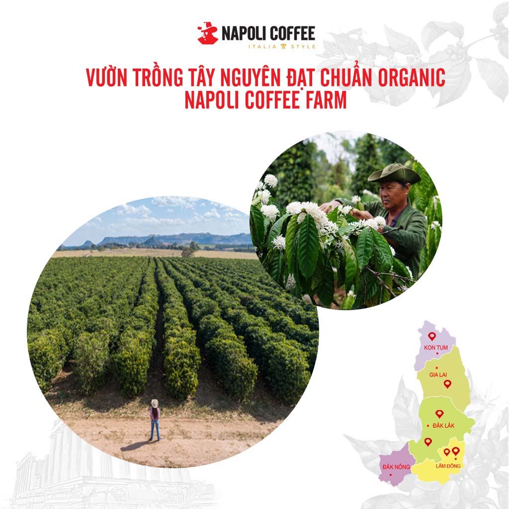 =>Hạt cà phê Robusta và Arabica được canh tác, thu hoạch và chế biến khép kín trên nông trại của Napoli, đảm chất lượng tuyệt đối, kèm với công nghệ rang mộc, chết biến hiện đại theo công thức độc quyền của nhà sáng lập. Vì thế chất lượng của ly cà phê sau khi pha đảm bảo nguyên bản và giá luôn rẻ nhất trên thị trường