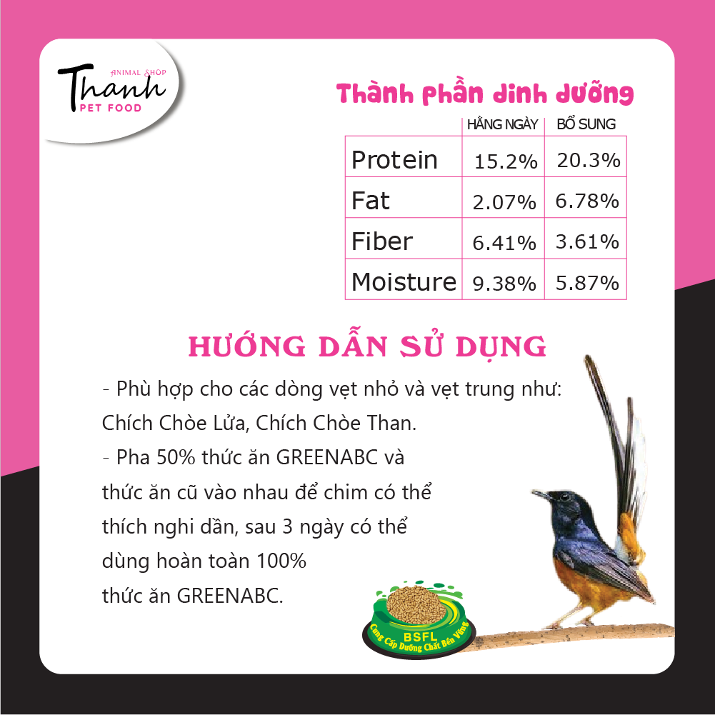 GREENABC - THỨC ĂN CHIM CHÍCH CHÒE HÀNG NGÀY & BỔ SUNG GREENABC là thức ăn cao cấp dành cho CHIM CHÍCH CHÒE. Đặc biệt sản phẩm GREENABC được sản xuất theo phương pháp Áp