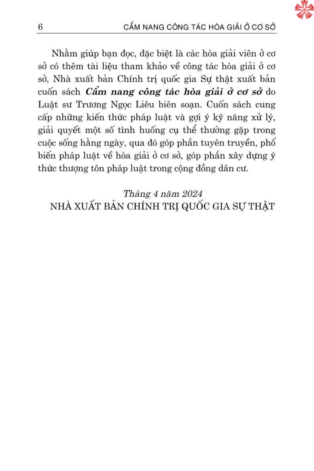 Công tác hòa giải ở cơ sở là một việc làm có ý nghĩa rất thiết thực đối với đời sống xã hội hiện nay nhằm mang lại niềm vui cho mọi người, mọi nhà, giữ gìn trật tự, an toàn xã hội, nâng cao ý thức pháp luật của người dân. Do vậy, việc các chính quyền ở cơ sở cần nắm vững những thông tin liên quan đến công tác hòa giải để giải quyết những mâu thuẫn, tranh chấp nhỏ trong nhân dân là một việc làm cần thiết. Đánh giá tầm quan trọng đó của công tác hòa giải, cuốn sách Cẩm nang công tác hòa giải ở cơ sở được xuất bản sẽ giúp chúng ta nhận thức được vấn đề đã nêu.