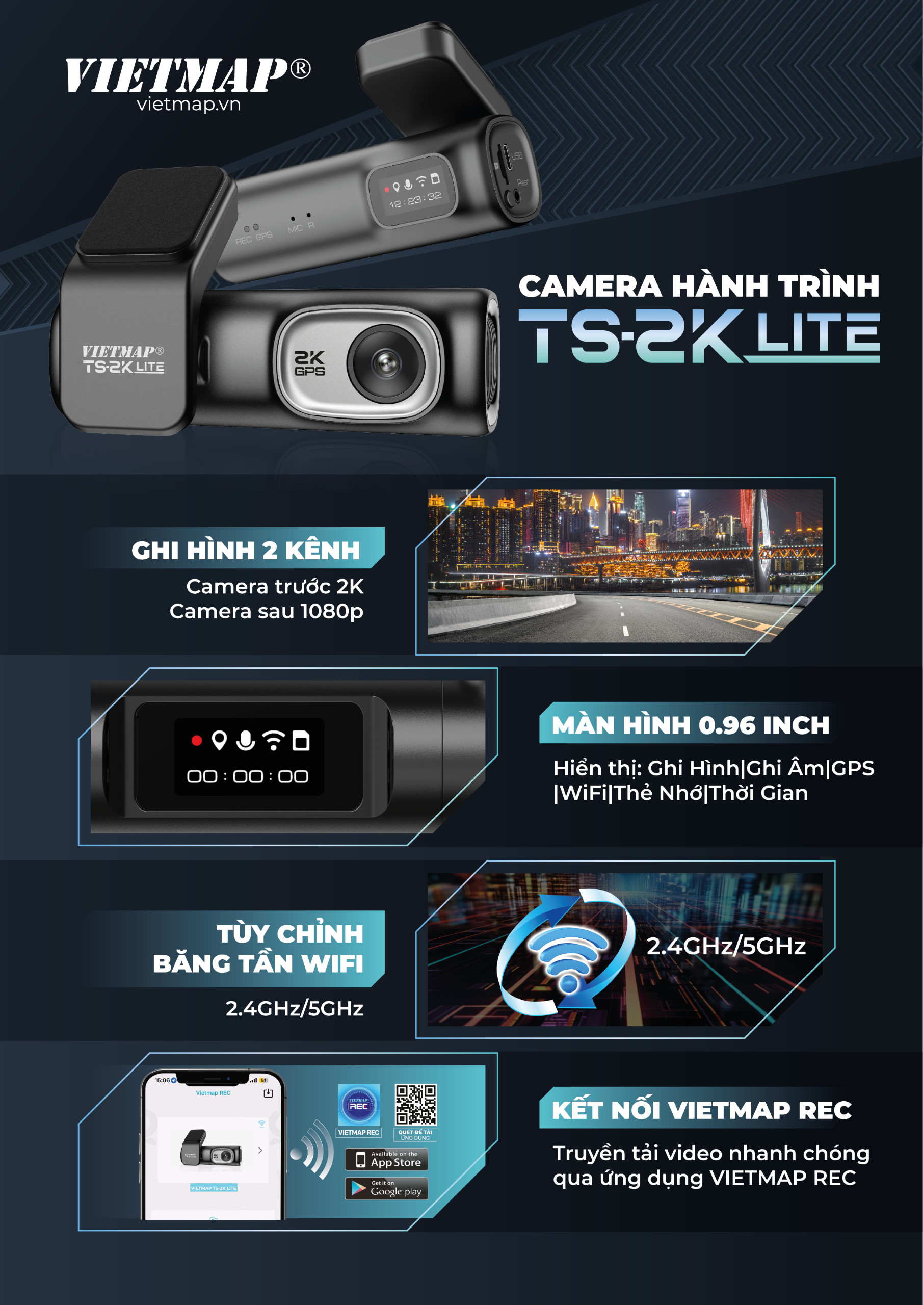 - Model: TS-2K Lite - Ghi hình 2 kênh trước sau, trước 2K, sau Full HD - Là dòng camera thuần ghi hình, không có cảnh báo giao thông bằng giọng nói Camera VIETMAP TS-2K