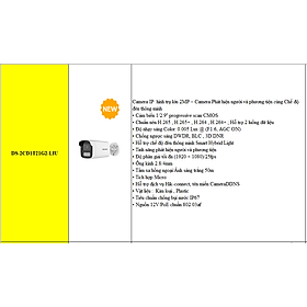 Thông số kỹ thuật camera IP 2MP thân trụ  DS-2CD1T21G2-LIU – Cảm biến 1/2.9″ progressive scan CMOS – Chuẩn nén H.265, H.265+, H.264, H.264+; Hỗ trợ 2 luồng dữ liệu – Độ nhạy sáng Color: 0.005 Lux @ (F1.6, AGC ON) – Độ phân giải tối đa (1920 × 1080)/25fps – Ống kính 2.8/4mm – Tầm xa hồng ngoại/Ánh sáng trắng: 50m – Chống ngược sáng DWDR, BLC, 3D DNR – Hỗ trợ chế độ đèn thông minh Smart Hybrid Light – Tính năng phát hiện người và phương tiện – Tích hợp Micro – Tiêu chuẩn chống bụi nước IP67 – Hỗ trợ dịch vụ Hik-connect, tên miền CameraDDNS – Vật liệu: Kim loại, Plastic – Nguồn cấp: 12V/PoE chuẩn 802.03af – Kích thước: 83.7 mm × 80.7 mm × 205.6 mm – Trọng lượng: 580 g – Xuất xứ: Trung Quốc – Bảo hành: 24 tháng