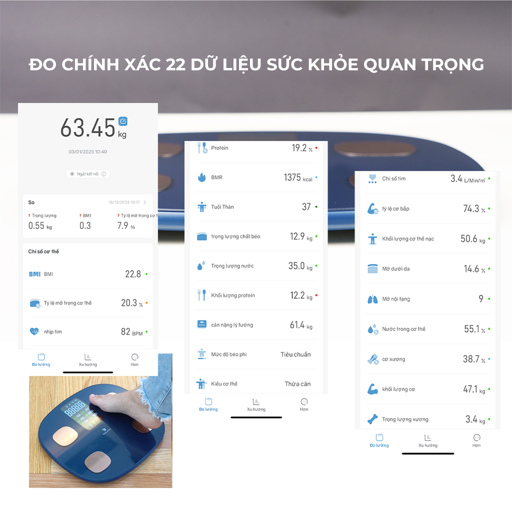 - CÂN ĐIỆN TỬ quản lý cân nặng và các thông số khác như chỉ số cơ thể, lượng chất béo,...