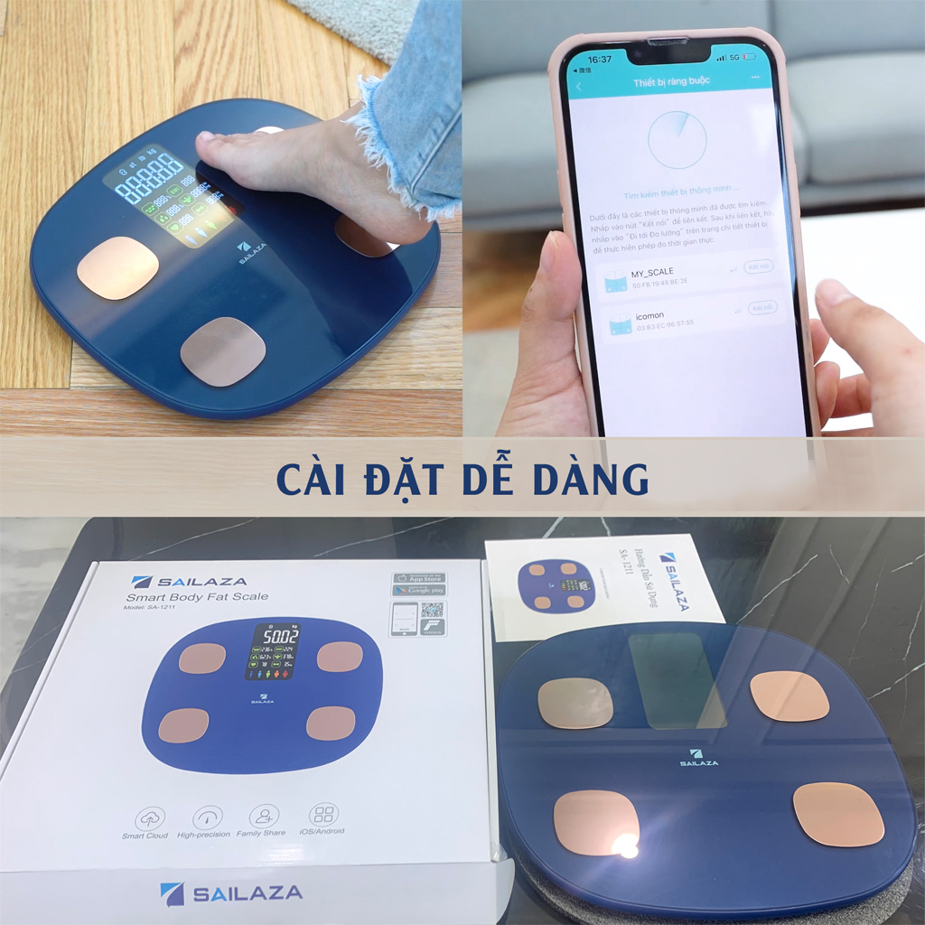 - Kiểm soát các số liệu theo chu kỳ định kỳ, giúp điều chỉnh công việc hoặc lối sống HƯỚNG DẪN SỬ DỤNG CÂN ĐIỆN TỬ SỨC KHOẺ: Bước 1: Lắp 4 x pin AAA. Đặt CÂN ĐIỆN TỬ SAILAZA trên nền phẳng cứng. Bước 2: Bật Bluetooth, vị trí trên điện thoại thông minh của bạn. Bước 3: Đăng ký tài khoản của bạn bằng địa chỉ thư hoặc tài khoản mạng xã hội. Bước 4: Chạm chân của bạn vào cân để kích hoạt màn hình. Bước 5: Bước lên cân bằng bàn chân ĐỂ TRẦN để bật cân Bước 6: Tiếp tục đứng trên cân cho đến khi tất cả dữ liệu được hiển thị. Sau khi hiển thị tất cả dữ liệu trong 10 giây, nó sẽ tự động tắt. Xem kết quả trên thiết bị đã kết nối CÁC ĐẶC ĐIỂM VƯỢT TRỘI (ĐẶC BIỆT) Đặc điểm nổi bật của CÂN ĐIỆN TỬ SA- 1211: