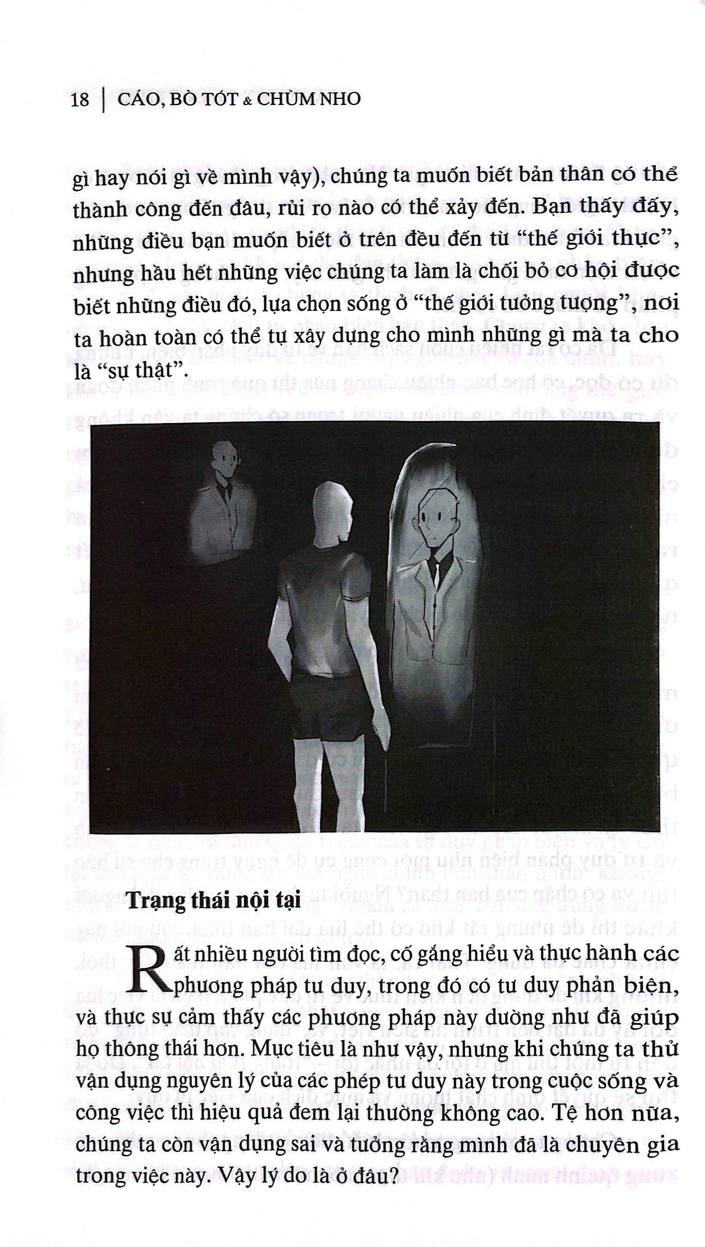 Cáo, Bò Tót Và Chùm Nho Chắc hẳn bạn đã từng nghe kể hoặc đọc câu chuyện ngụ ngôn nổi tiếng “Con cáo và chùm nho” của nhà văn Aesop. Vậy bạn còn nhớ những gì về chú cáo trong câu chuyện đó ngoại trừ việc nó không hái được nho, chê nho xanh và chua, sau đó rời đi? Bạn đã từng bao giờ thấy bản thân m.ình trong chú cáo đó chưa? Bạn đã từng muốn “hái” một “chùm nho” nào đó mà không thực hiện được, sau đó tức tưởi bỏ qua và tự nhủ rằng nó “xanh” và “chua”, từ đó hợp lý hóa cho quyết định bỏ cuộc của m.ình? Trong cuốn sách này, bằng việc xây dựng lại cốt truyện, Cáo đã có thêm Bò tót làm bạn đồng hành trên hành trình tìm kiếm và hái những chùm nho. Câu chuyện mới được kể lại và phân tích qua 9 chương từ góc nhìn tâm lý học, người đọc sẽ đồng hành cùng Cáo và Bò tót trong quá trình phán đoán, tiếp nhận, xử lý thông tin, đi kiếm tìm và giao dịch những chùm nho quý báu. Khi khép lại cuốn sách, người đọc sẽ giật m.ình nhận ra rằng trong khi dành phần lớn thời gian để suy nghĩ và hành động một cách bản năng, chúng ta lại tự cho rằng m.ình sáng suốt và lý trí, thực tế này đến ngay cả khi chúng ta đã cố gắng áp dụng các phương pháp tư duy phản biện đã học hay đọc được ở đâu đó. Thông qua hành trình cùng hai nhân vật, người đọc có thể tự vẽ ra bối cảnh rằng m.ình đang đi rừng, leo núi hay bất cứ hoạt động nào khác để tới với những “chùm nho”. Tuy nhiên mục tiêu đó đòi hỏi phải đối diện với sự phức tạp và biến thiên của thế giới thực. Nó hiện hữu, xảy ra thường xuyên đến mức ta buộc phải liên tục suy nghĩ và đưa ra phán đoán, tìm ra phương án giải quyết từ những việc nhỏ nhặt nhất hàng ngày như việc tắt chuông báo thức mỗi sáng cho đến đến những quyết định ảnh hưởng to lớn đến chất lượng cuộc sống và công việc trong suốt cuộc đời. Không chỉ dừng ở đó, cuốn sách còn cung cấp cho người đọc một loạt giải pháp để có thể thực sự làm chủ cách chúng ta suy nghĩ và sử dụng tri thức – thứ mà chúng ta tưởng rằng chỉ thuộc quyền sở hữu của bản thân và bất khả x.âm phạm. Đã bao giờ bạn nghe thấy, hoặc tự hỏi m.ình những câu hỏi sau mà chưa có đáp án thỏa mãn: