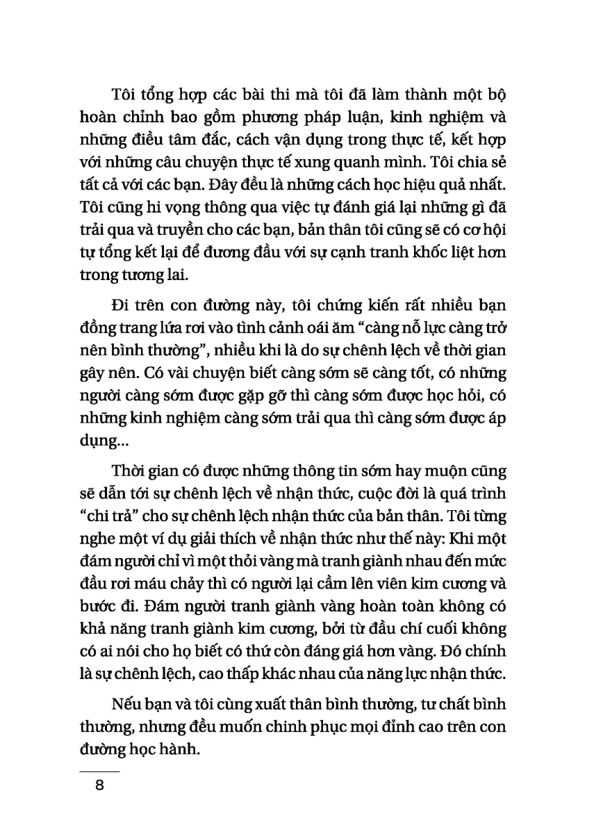 Mua tại TiktokCao Thủ Học Tập CAO THỦ HỌC TẬP - 2 giờ đọc cuốn sách này sẽ giúp bạn rút ngắn khoảng thời gian 20 năm học tập trong tương lai Làm thế nào để các bạn trẻ đang trong tình trạng mịt mờ có thể trở nên tốt hơn và mạnh mẽ hơn? Câu trả lời nằm gọn trong cuốn sách này. Nó như ngọn lửa không ngừng tiếp thêm cho bạn nguồn động lực vươn lên và cùng bạn theo đuổi ước mơ cao xa không giới hạn của mình. Cuốn sách cho chúng ta nhìn thấy được phương pháp học tập thiên về tiếp thu, phân tích, tổng kết, quy nạp của Trương Tự Hào. Đây là thứ mà rất nhiều người trẻ tuổi muốn thành công đang cần. Tác giả Trương Tự Hào là sinh viên đại học đầu tiên trong gia đình của anh; học giả Học viện Stephen A.Schwarzman – Đại học Thanh Hoa; thanh niên xuất sắc toàn cầu Davos; người sáng lập ra Plantag và là đại sứ thương hiệu Thanh niên Trung Quốc với Toeft. Anh sở hữu 5 triệu fan toàn cầu, kết hợp với quá trình tự lực trưởng thành từ một thiếu niên ở thị trấn nhỏ trở thành thạc sỹ đại học Thanh Hoa, sáng tạo và truyền tải những nội dung tri thức và phong cách sống, tái hiện lại trách nhiệm xã hội và tinh thần dũng cảm của lớp thanh niên trẻ tuổi ngày nay, ngày càng cổ vũ khích lệ được nhiều người hơn phấn đấu vươn lên. Nếu bạn có xuất thân bình thường, tư chất bình thường, nhưng đều muốn chinh phục mọi đỉnh cao trên con đường học hành. Nếu bạn có một xuất phát điểm tốt, tuy tài cao nhưng vẫn muốn phấn đấu nhiều hơn. Nếu bạn vừa tốt nghiệp, đứng nhìn cuộc đời với tương lai mờ mịt. Nếu bạn là một phụ huynh học sinh, hết lòng lo lắng cho sự trưởng thành của con cái. Vậy thì hãy dành ra hai tiếng đồng hồ để đọc quyển sách này, nó sẽ giúp bạn xóa mờ khoảng cách chênh lệch thời gian đến hai mươi năm. Sau đó, nó sẽ giúp bạn làm bài thi của mình trong trạng thái thoải mái nhất. Tác giả đề cập đến ba phần: Phá bỏ, đòn bẩy, nâng tầm. Đầu tiên, cần phải có một nền móng vững chắc, đạt tới trình “ưu tú”. Tiếp theo, vận dụng đòn bẩy cuộc đời, đạt tới trình “kiệt xuất”. Cuối cùng, xây dựng lại tư duy, nâng tầm nhận thức, làm bạn với thời gian và đạt tới trình “kiệt xuất bền vững”. Ngày nhỏ, tác giả từng rất ngưỡng mộ những bạn được cha mẹ chăm bẵm, khi gặp phải những vấn đề rắc rối trong học tập thì luôn có cha mẹ giúp đỡ. Anh cũng từng trách móc cha mẹ của mình rằng tại sao trong việc học hành, họ không thể giúp gì được cho mình? Tại sao họ đều chỉ mới tốt nghiệp tiểu học? Ngoài việc nhận thức bản thân có xuất thân bình thường, tấc giả còn biết rõ mình không phải là thiên tài. Bí quyết của anh luôn là: “Cần cù bù thông minh”. Thiên tài chỉ chiếm 1% dân số, họ thực ra không cần phải học, không cần phải cố gắng, cũng không cần phải rèn luyện… Còn đa số chúng ta không phải là người như vậy. Trong quá trình học tập, anh tổng hợp các bài thi thành một bộ hoàn chỉnh bao gồm phương pháp luận, kinh nghiệm và những điều tâm đắc, cách vận dụng trong thực tế, kết hợp với những câu chuyện thực tế xung quanh mình. Anh chia sẻ tất cả với trong cuốn sách này. Đây đều là những cách học hiệu quả nhất. Thông qua việc tự đánh giá lại những gì đã trải qua và truyền chúng cho người khác, bản thân tác giả cũng sẽ có cơ hội tự tổng kết lại để đương đầu với những sự cạnh tranh khốc liệt hơn trong tương lai. Đi trên con đường này, tác giả chứng kiến rất nhiều bạn đồng trang lứa rơi vào tình cảnh oái ăm “càng nỗ lực càng trở nên bình thường”, nhiều khi là do sự chênh lệch về thời gian gây nên. Có vài chuyện biết càng sớm sẽ càng tốt, có những người càng sớm được gặp gỡ thì càng sớm được học hỏi, có những kinh nghiệm càng sớm trải qua thì càng sớm được áp dụng... Thời gian có được những thông tin sớm hay muộn cũng sẽ dẫn tới sự chênh lệch về nhận thức, cuộc đời là quá trình “chi trả” cho sự chênh lệch nhận thức của bản thân. Cuốn sách này hoàn toàn không phải để hướng dẫn bạn làm sao để trở nên ưu tú, bởi vì đây quả thực là một việc quá đỗi đơn giản, hoàn toàn không cần đến một cuốn sách dày như thể này để giảng giải. “Ưu tú” chỉ là thứ căn bản, mọi thành công đều bắt đầu từ đó. Thế nên hãy làm thật tốt hai chữ “ưu tú” này. Khi có được nền tảng cơ bản rồi thì tương lai dù bạn có phát triển theo hướng nào, nó cũng đều đủ sức hỗ trợ cho bạn tiến xa và vươn cao hơn. Đứng ở hiện tại nhìn về những gì đã qua trong cuộc đời mình, tác giả phát hiện ra rằng, trong quãng đời học sinh, tiêu chuẩn để cân đong đo đếm hai chữ “ưu tú” thật quá đỗi đơn giản. Đó là thành tích. Vì vậy ở chương đầu tiên tác giả sẽ bắt đầu từ gia đình mình, nơi anh sinh ra, qua đ