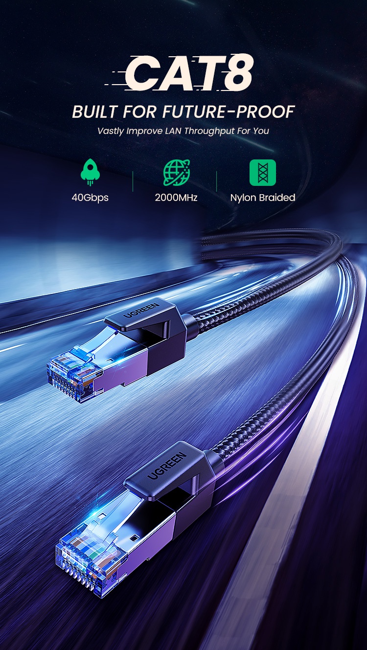 Tốc độ mạng cáp Cat8 đúc sẵn bọc dù dài 15M Ugreen 30799 hỗ trợ chuẩn BASE-T 40Gbps và tốc độ mạng nhanh hơn nhiều so với cáp Cat7 tiêu chuẩn hỗ trợ 10Gbps.