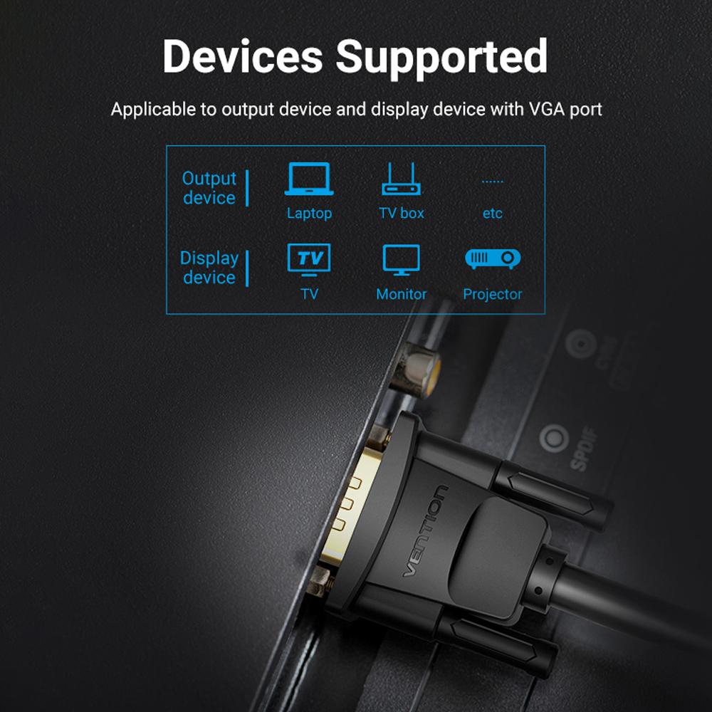 VENTION VGA extension cable with 15PIN allows you to connect projectors, displayer, TV, monitor with VGA interface to your laptop or PC for high quality videos or photos. It supports 1080P HD resolution. Features: Pursuit