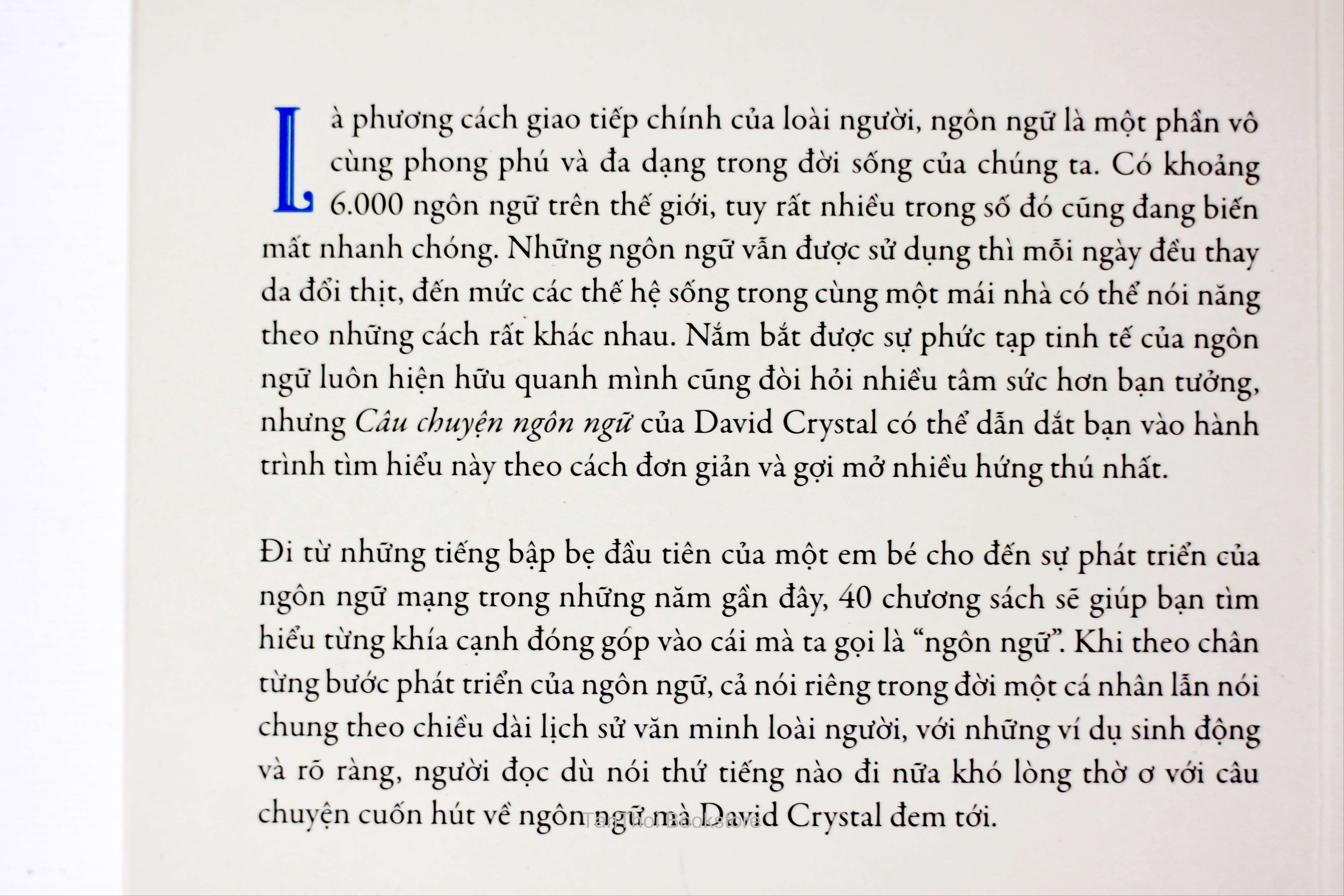 “Tác giả tóm gọn một cách mượt mà lượng kiến thức lớn của ông về những điểm dị biệt trong cách đánh vần, ngữ pháp, chính tả, và ảnh hưởng của những phong cách ngôn ngữ mới (ngôn ngữ máy tính, tin nhắn) đối với sự phát triển của ngôn ngữ. Đây là cuốn sách nhập môn hoàn hảo cho bất kỳ ai hứng thú với chủ đề này.” – Publishers Weekly ��Là phương cách giao tiếp chính của loài người, ngôn ngữ là một phần vô cùng phong phú và đa dạng trong đời sống của chúng ta. Có khoảng 6.000 ngôn ngữ trên thế giới, tuy rất nhiều trong số đó cũng đang biến mất nhanh chóng. Những ngôn ngữ vẫn được sử dụng thì mỗi ngày đều thay da đổi thịt, đến mức các thế hệ sống trong cùng một mái nhà có thể nói năng theo những cách rất khác nhau. Nắm bắt được sự phức tạp tinh tế của ngôn ngữ luôn hiện hữu quanh mình cũng đòi hỏi nhiều tâm sức hơn bạn tưởng, nhưng Câu chuyện ngôn ngữ của tác giả có thể dẫn dắt bạn vào hành trình tìm hiểu này theo cách đơn giản và gợi mở nhiều hứng thú nhất. ��Đi từ những tiếng bập bẹ đầu tiên của một em bé cho đến sự phát triển của ngôn ngữ mạng trong những năm gần đây, 40 chương sách sẽ giúp bạn tìm hiểu từng khía cạnh đóng góp vào cái mà ta gọi là “ngôn ngữ”. Khi theo chân từng bước phát triển của ngôn ngữ, cả nói riêng trong đời một cá nhân lẫn nói chung theo chiều dài lịch sử văn minh loài người, với những ví dụ sinh động và rõ ràng, người đọc dù nói thứ tiếng nào đi nữa cũng không thể thờ ơ với câu chuyện cuốn hút về ngôn ngữ trong cuốn sách này. �TÁC GIẢ: �(sinh năm 1941) là nhà ngôn ngữ học, cây viết, biên tập viên, giảng viên người Anh. Ông từng giữ vị trí trưởng khoa tại Đại học Reading trong mười năm và hiện là giáo sư danh dự môn Ngôn ngữ học tại Đại học Bangor. Ông là tác giả và đồng tác giả của khoảng một trăm cuốn sách, chủ yếu trong lĩnh vực ngôn ngữ học, bao gồm một số bộ bách khoa toàn thư, nhưng cũng có cả kịch và thơ. Ông sáng lập và tham gia công tác biên tập cho nhiều tạp chí khoa học về ngôn ngữ học. Bên cạnh đó, ông còn làm việc trong các chương trình phát thanh và truyền hình, bao gồm nhiều phim tài liệu về ngôn ngữ của BBC, trong vai trò cố vấn, biên kịch, và người dẫn chương trình. ��Ông hiện đang sống và làm việc tại nhà mình ở miền Bắc xứ Wales.   * Số trang 336 Khổ 15,5 24cm