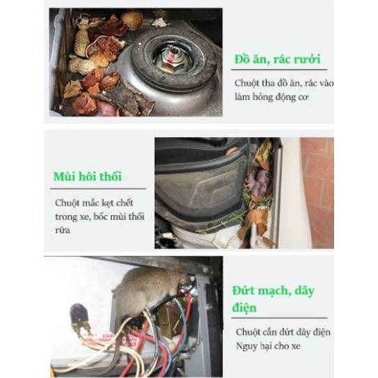 Bạn đang cảm thấy khó chịu vì để xe ở ngoài đường, kho... có nhiều chuột. Bạn mở nắp capo lên và thường xuyên thấy dấu chân chuột trong khoang máy. Xuất hiện những vết cắn nham nhở trên các chi tiết nhựa trong khoang máy. Đã đến lúc cần phải can thiệp ngay trước khi Xe bạn có nguy cơ bị lũ chuột tàn phá nặng nề hơn.