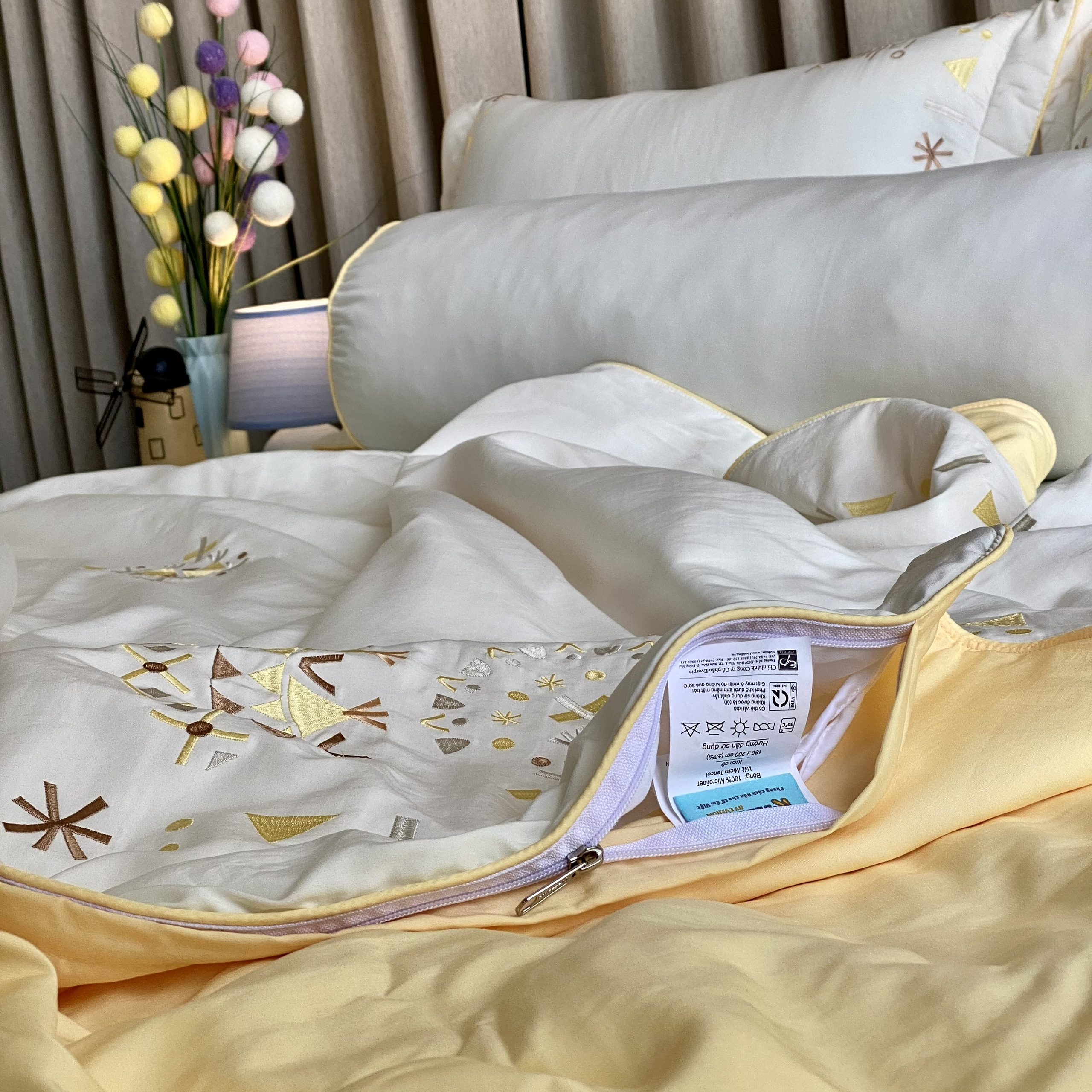 Chất liệu: Tencel. Xuất xứ : Việt Nam. Họa tiết hoa loa kèn nhỏ kết hợp cùng hoa văn cô điển được thêu màu chỉ nâu nhạt trên nền vải Tensen màu vàng mỡ gà,đây