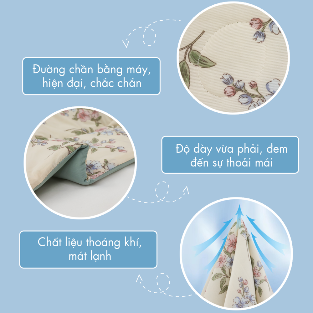 Chất liệu: Vải bên ngoài: Cotton nhung Gòn bên trong: Gòn Microfiber - Kích thước: 220x230 cm - Mật độ sợi: 520 TC (Thread Count) - Tính năng vượt trội: Thiết kế trẻ trung, năng