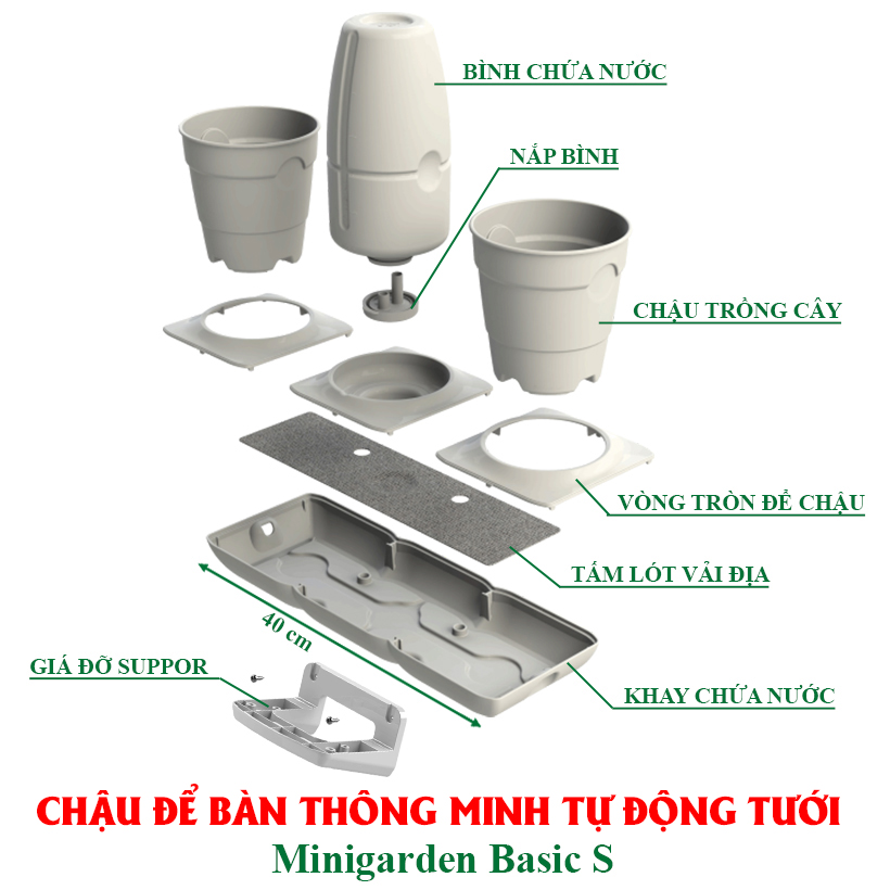 1.Mô Tả Chậu KIT Tự Dưỡng Minigarden Basic: + Nhập khẩu: Bồ Đào Nha + Kích thước Base Chậu: Ngang 38cm x 14 cm x 22 cm. Bảo Hành Chậu Tự Dưỡng Basic lên đến 10
