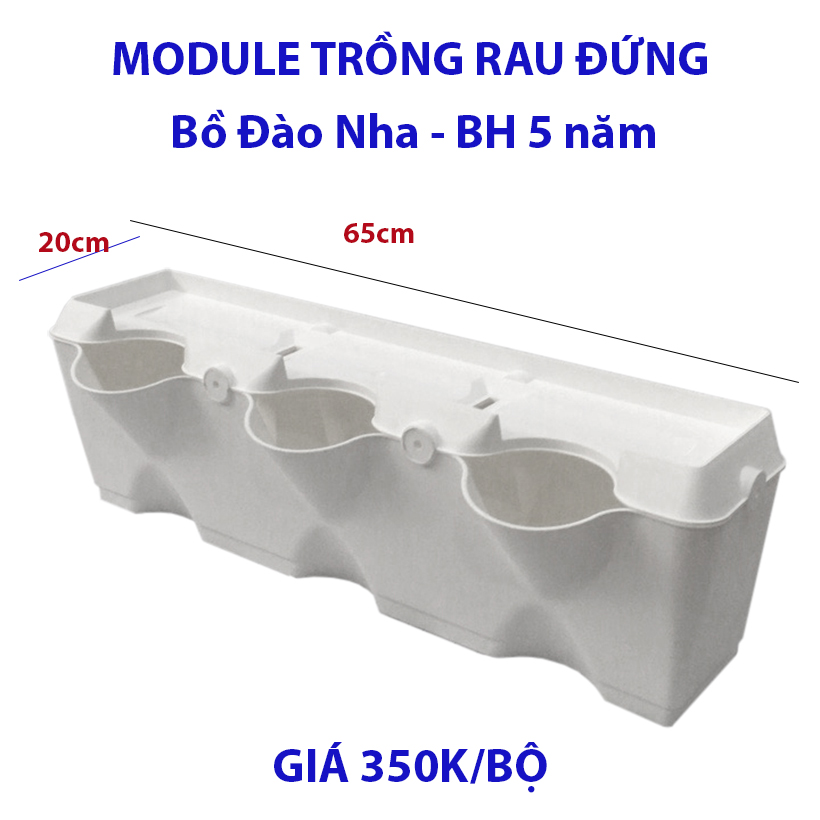 • Kích thước Module trồng rau Đứng: Ngang 65cm x Rộng 20cm X Cao 20cm. Trồng được 3 cây. Gồm 1 module + 1 Nắm đậy + 6 nút cài cố định Module