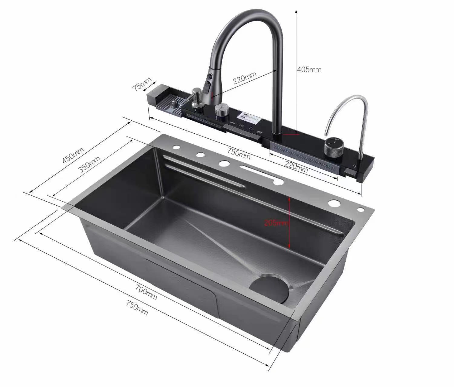 THÔNG TIN SẢN PHẨM • Tên sản phẩm : Chậu rửa Inox 304 • Phụ kiện đi kèm : Chậu rửa chén, vòi rửa chén nóng lạnh dương mặt chậu, khay hứng nước inox nhỏ, khay mưa, thớt gỗ, túi bọc sản phẩm • Chất liệu: Inox mạ nano xám đen • Kích thước sản phẩm: D750 x R450 x C230 mm • Kích thước khoét đá: D720 x R420 mm