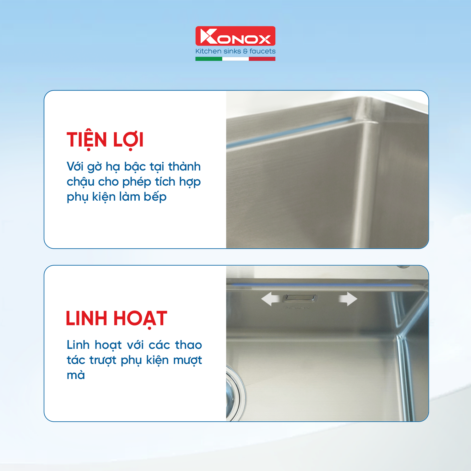 Chậu rửa bát KN 11650TD là sản phẩm duy nhất trong bộ sưu tập chậu handmade có tích hợp bàn chờ. Một cải tiến mới về cả thẩm mỹ và công năng từ Konox. Không chỉ kết hợp được trọn vẹn bề mặt xước mờ hiện đại cùng thiết kế hạ bậc độc đáo mà còn có thêm phần bàn chờ rộng rãi giúp mở rộng không gian thao tác trên mặt chậu, giúp người sử dụng có thêm không gian để thao tác và giữ cho khu vực xung quanh quầy bếp luôn khô ráo.