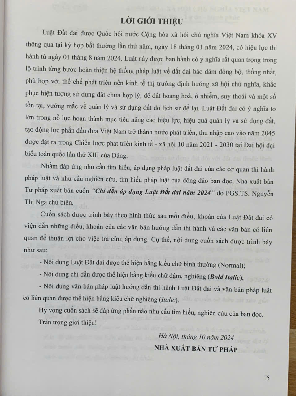 Nhằm đáp ứng nhu cầu tìm hiểu, áp dụng pháp luật đất đai của các cơ quan thi hành pháp luật và nhu cầu nghiên cứu, tìm hiểu pháp luật của đông đảo bạn đọc, Nhà xuất bản Tư pháp xuất bản cuốn “Chỉ dẫn áp dụng Luật Đất đai năm 2024” do PGS.TS. Nguyễn Thị Nga chủ biên.