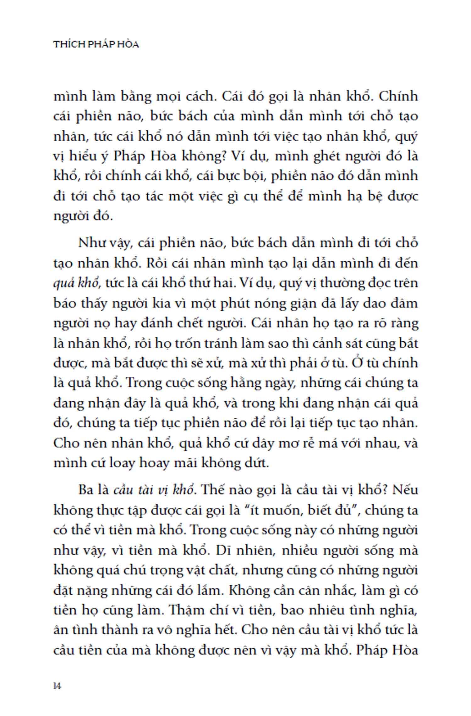Trong quyển sách này, quý vị sẽ được tiếp cận Nhân Quả theo một cách giản dị qua những câu chuyện đời thường của thầy Thích Pháp Hòa. Trong khi ngôn ngữ của giáo lý thường là rào cản thì những câu chuyện vui, những ví dụ gần gũi lại có khả năng mang chúng ta đến gần hơn với sự thật của đời sống. Những lời chia sẻ và câu chuyện của thầy Pháp Hòa về các mối quan hệ và cách ứng xử trong xã hội như cha mẹ - con cái, vợ - chồng, thầy - trò, bạn bè, … cũng được ban biên tập tuyển chọn và giới thiệu đến quý bạn đọc. Thông qua đó, chúng ta thấy được “Phật pháp tại thế gian, bất ly thế gian giác” – Phật pháp không ở đâu xa ngoài đời sống thế gian.