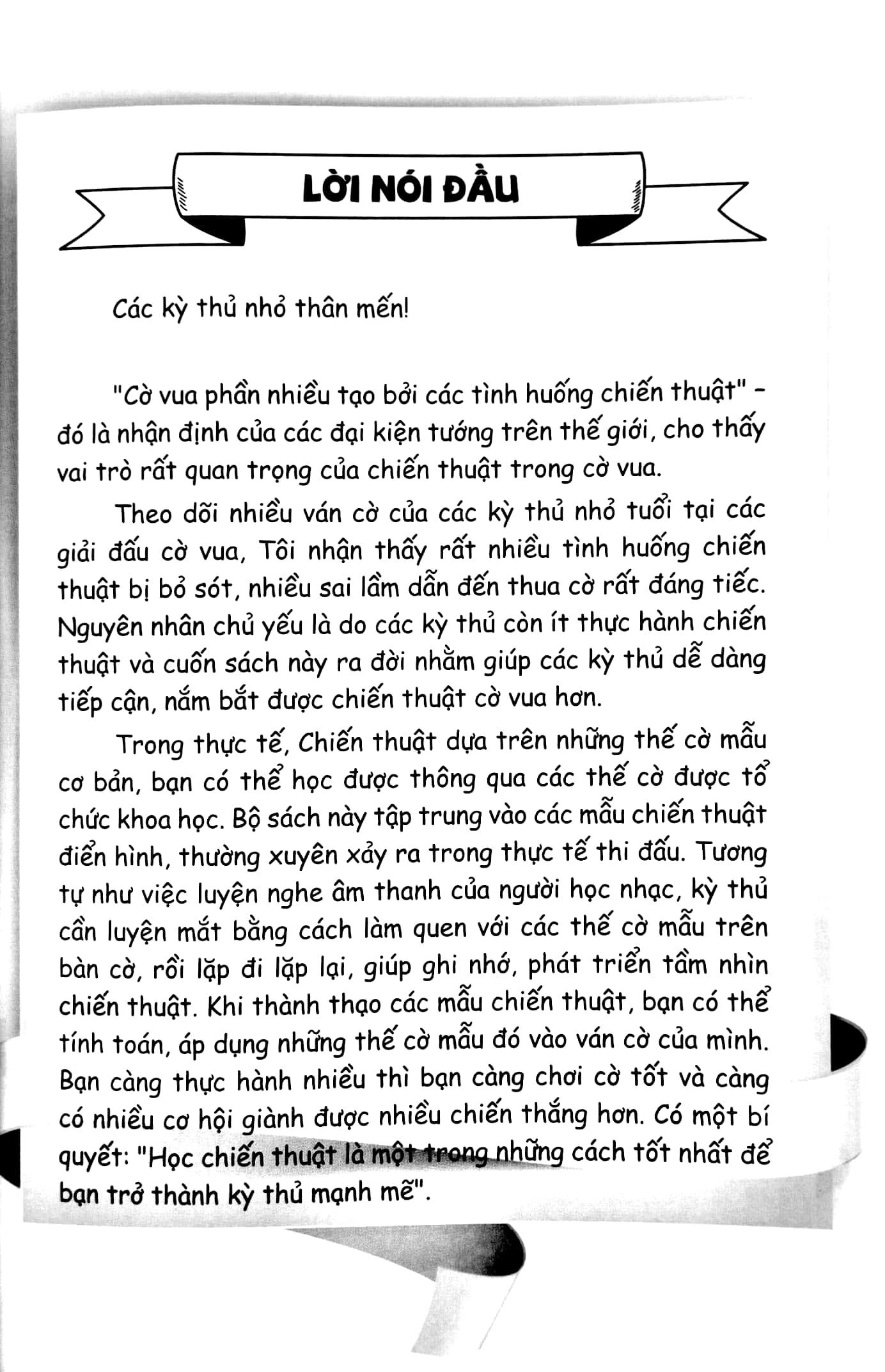 Theo dõi nhiều ván cờ của các kỳ thủ nhỏ tuổi tại các giải đấu cờ vua, Tôi nhận thấy rất nhiều tình huống chiến thuật bị bỏ sót, nhiều sai lầm dẫn đến thua cờ rất đáng tiếc. Nguyên nhân chủ yếu là do các kỳ thủ còn ít thực hành chiến thuật và cuốn sách này ra đời nhằm giúp các kỳ thủ dễ dàng tiếp cận, nắm bắt được chiến thuật cờ vua hơn.