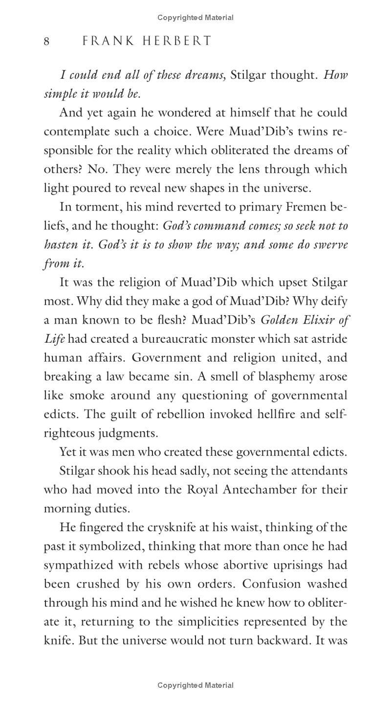 Facing treason and rebellion on two fronts, Alia’s rule is not absolute. The displaced House Corrino is plotting to regain the throne while the fanatical Fremen are being provoked into open revolt by the enigmatic figure known only as The Preacher. Alia believes that by obtaining the secrets of the twins’ prophetic visions, she can maintain control over her dynasty.