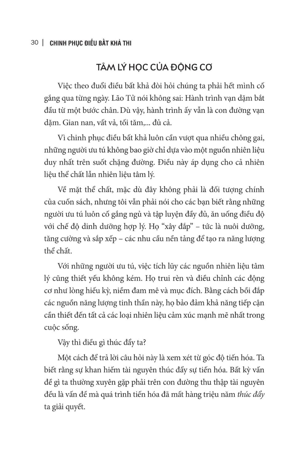 Chinh phục điều bất khá sẽ giúp bạn khám phá bộ tứ khả năng nhận thức – động lực, khả năng học hỏi, tính sáng tạo và dòng chảy. Rồi ta sẽ hiểu tại sao các kỹ năng này lại thiết yếu đến thế đối với hiệu suất đỉnh cao. Ta sẽ thấy cách chúng hoạt động trong bộ não và trong cơ thể. Và ta sẽ dùng hiểu biết này để tăng tốc trên con đường chinh phục điều bất khả.