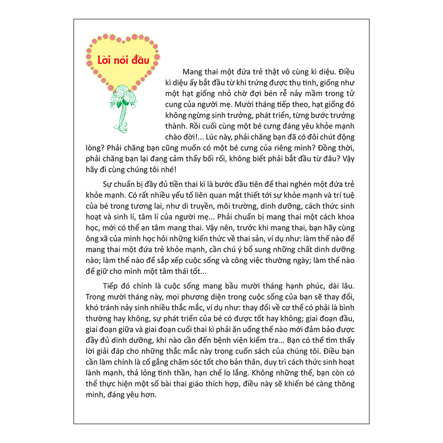 Cuốn sách này đề cập đến các vấn đề thai sản bắt đầu từ khi chuẩn bị mang thai, lời văn bình dị, gần gũi, giới thiệu đến bạn những kiến thức trên phương diện chăm sóc sức khỏe về dinh dưỡng, sinh hoạt, tâm lí, vận động tiền thai kì, trong thai kì, khi sinh nở và sau khi sinh nở, giúp các mẹ chăm sóc bản thân và bé tốt hơn.