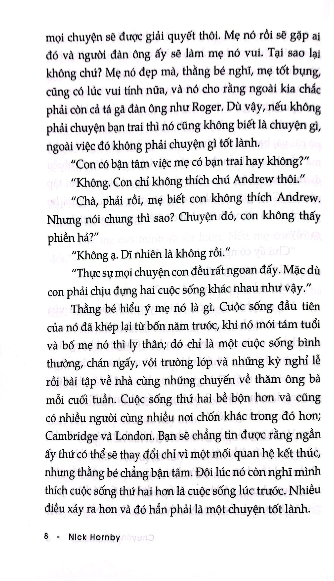 Dưới ngòi bút tinh tường mà hấp dẫn của Nick Hornby, Chuyện một cậu bé kể về tình bạn khác thường giữa một người đàn ông không chịu lớn và một cậu bé già trước tuổi, và xóa nhòa ranh giới giữa họ một cách cuốn hút và vô cùng ấm áp.