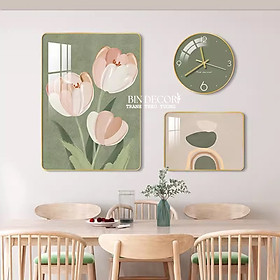 ✨(CÓ ẢNH THẬT) Tranh đồng hồ tráng gương hoa tulip bộ 3 tranh bo viền kèm đinh và pin