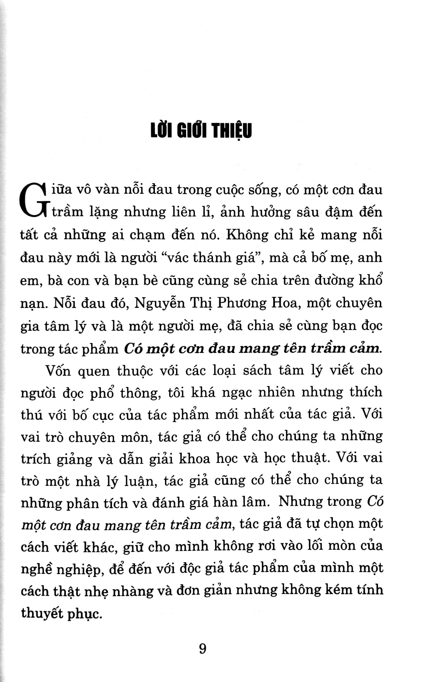 Cuốn sách Có một cơn đau mang tên ầ c.ả được viết bằng những chia sẻ, ghi chú tỉ mỉ dưới góc nhìn của một nhà khoa học có trải nghiệm cá nhân trong việc đồng hành cùng người thân vượt qua quãng thời gian dài ầ c.ả Khác với những kết luận, dẫn chứng của một nhà nghiên cứu đơn thuần, cuốn sách chứa đựng những câu chuyện nhỏ hằng ngày, giúp bạn đọc hình dung ra những biểu hiện cụ thể, những diễn biến cảm xúc - hành vi cụ thể, những mẩu đối thoại hằng ngày mà một người mẹ có thể giúp con trai m.ình vượt qua những cơn trầm cảm, những xáo trộn trong sinh hoạt gia đình; những nỗi buồn, những khoảnh khắc mà người thân của người có bệnh trầm cảm phải đối mặt để động viên, giữ vững tinh thần cho chính m.ình.