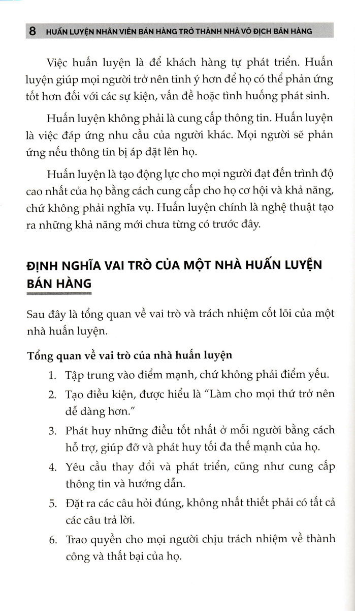 Cuốn sách này bao gồm các nghiên cứu điển hình, chiến lược xoay chuyển tình thế trong 30 ngày dành cho những người làm việc kém hiệu quả, một thư viện gồm các biểu mẫu và kịch bản huấn luyện, cũng như hàng trăm câu hỏi huấn luyện mạnh mẽ. Bạn có thể sử dụng ngay lập tức để huấn luyện bất kỳ ai trong mọi tình huống. Huấn Luyện Nhân Viên Bán Hàng Trở Thành Nhà Vô Địch Bán Hàng là cẩm nang của bạn để tạo ra một nền văn hóa huấn luyện tiến bộ và xây dựng đội ngũ những nhân viên hàng đầu .