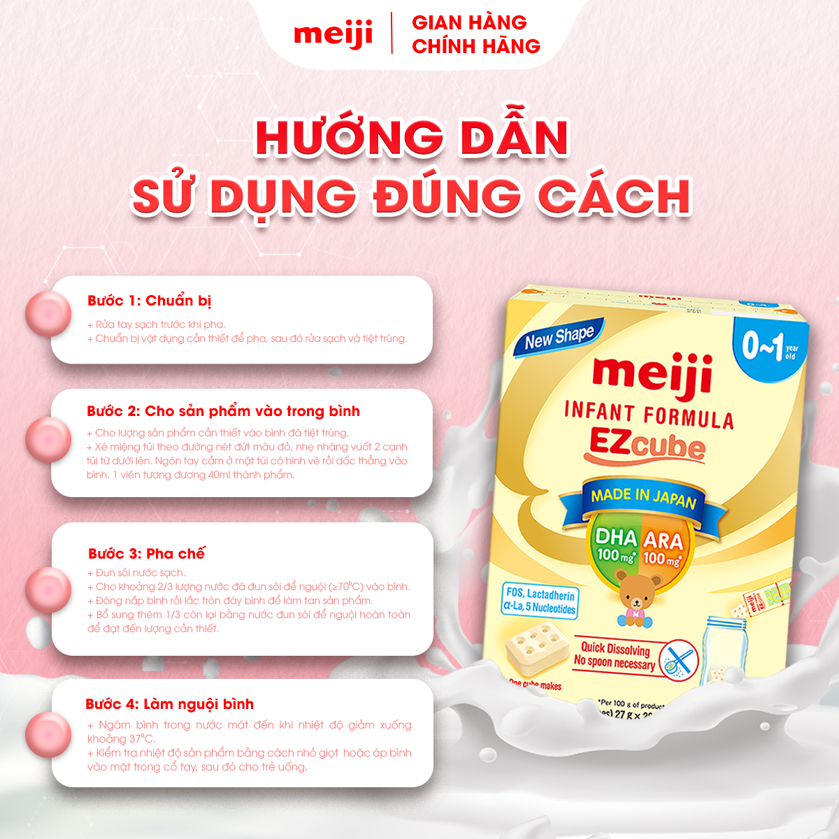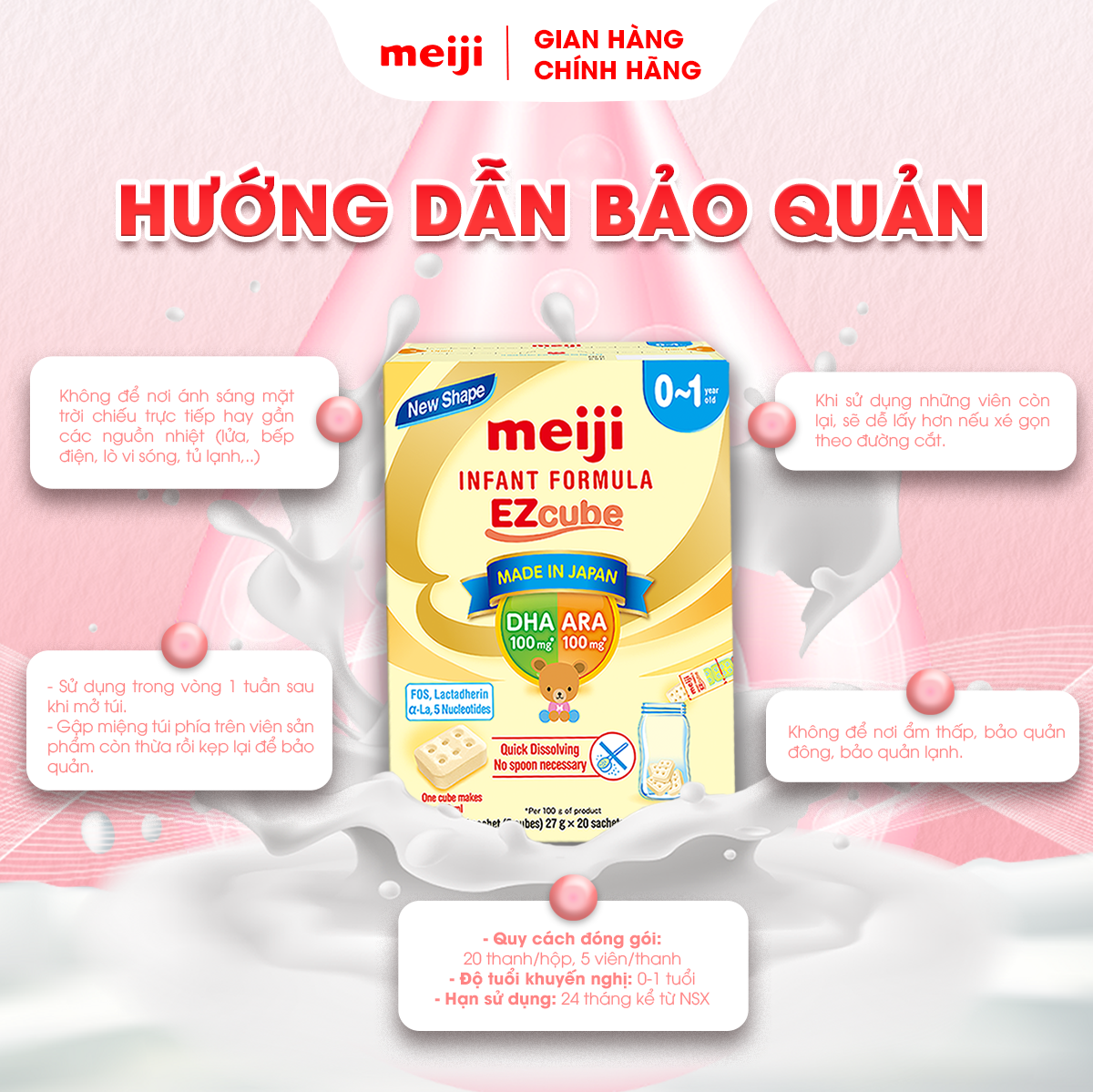 - Kiểm tra nhiệt độ sản phẩm bằng cách nhỏ giọt lên mặt trong cổ tay, sau đó cho trẻ uống. HƯỚNG DẪN BẢO QUẢN MEIJI INFANT FORMULA EZCUBE HƯỚNG DẪN BẢO QUẢN SẢN PHẨM MEIJI INFANT FORMULA LỜI CẢM ƠN