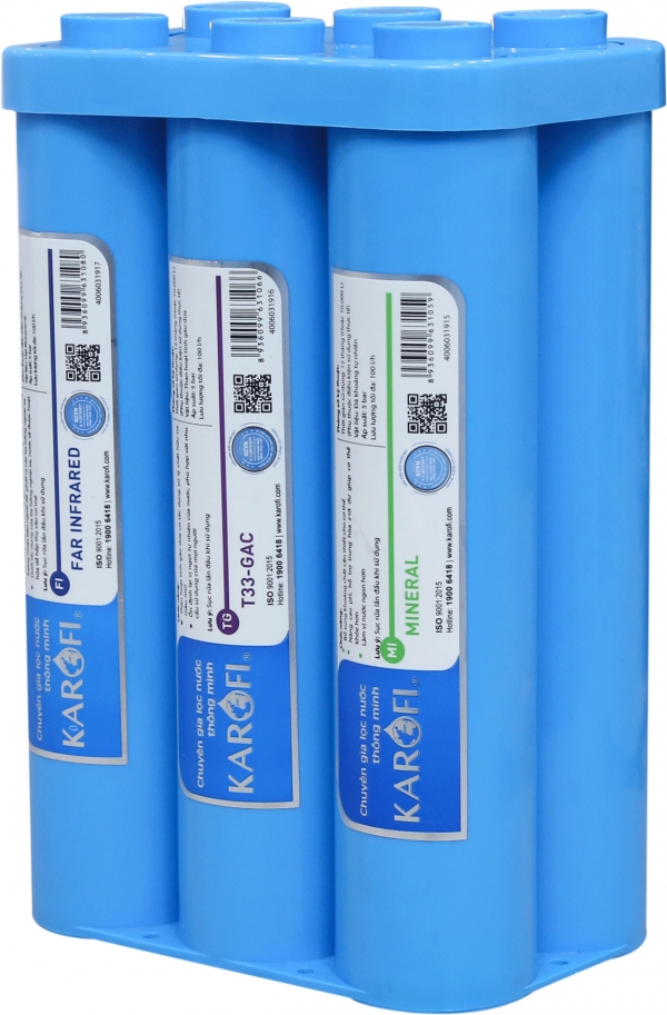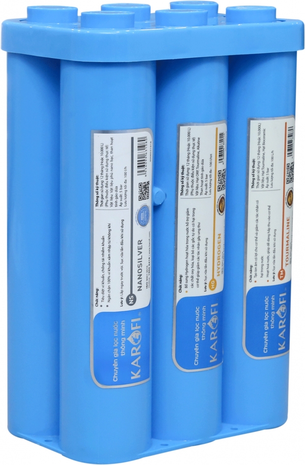 - bảo vệ màng RO không bị tắc bởi chất rắn lơ lửng rất nhỏ Lõi lọc số 4 Karofi hay còn gọi là màng lọc RO. Đây là bộ phận quan trọng nhất của chiếc lõi lọc nước Karofi được ví như quả thận của con người. Màng RO 100GDP được nhập khẩu nguyên chiếc từ Mỹ (USA) được sản xuất bằng vật liệu đặc biệt có độ bền cao an toàn tuyệt đối. Nguyên liệu của lõi lọc số 4 Karofi: Vật liệu lõi lọc nước Karofi đặc biệt Màng RO thẩm thấu ngược, có khe lọc đạt 0,0001 micron. Công suất 20l/h Chức năng của lõi lọc số 4 Karofi: Lọc nước Karofi loại bỏ hoàn toàn chất rắn, khí hoàn toàn trong nước, các Ion kim loại nặng, vi sinh vật, vi khuẩn, siêu vi khuẩn Amip ăn não người, các chất hữu cơ làm cho nước trở nên hoàn toàn tinh khiết nhưng không làm thay đổi tính lý – hoá của nó Tuổi thọ lõi lọc nước Karofi số 4: 1.5năm đến 3 năm (~ 90.000 lít) Bộ 6 Lõi Chức Năng Đúc Nguyên Khối Karofi SMAX Hiệu Suất Cao HP 6.2