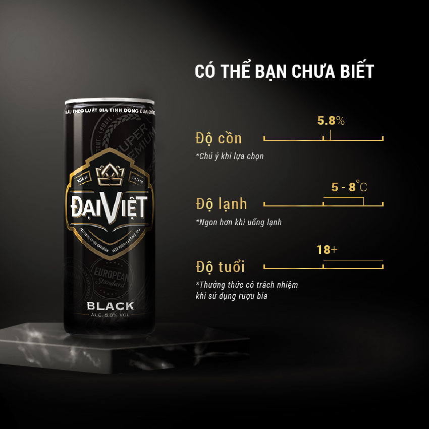 ĐẠI VIỆT BLACK – Bia Đen dành cho người Việt có "Gu" Sử dụng công nghệ sản xuất bia tinh dòng của Xứ Beyer miền Tây nước Phổ (nay là CHLB Đức) kết hợp với
