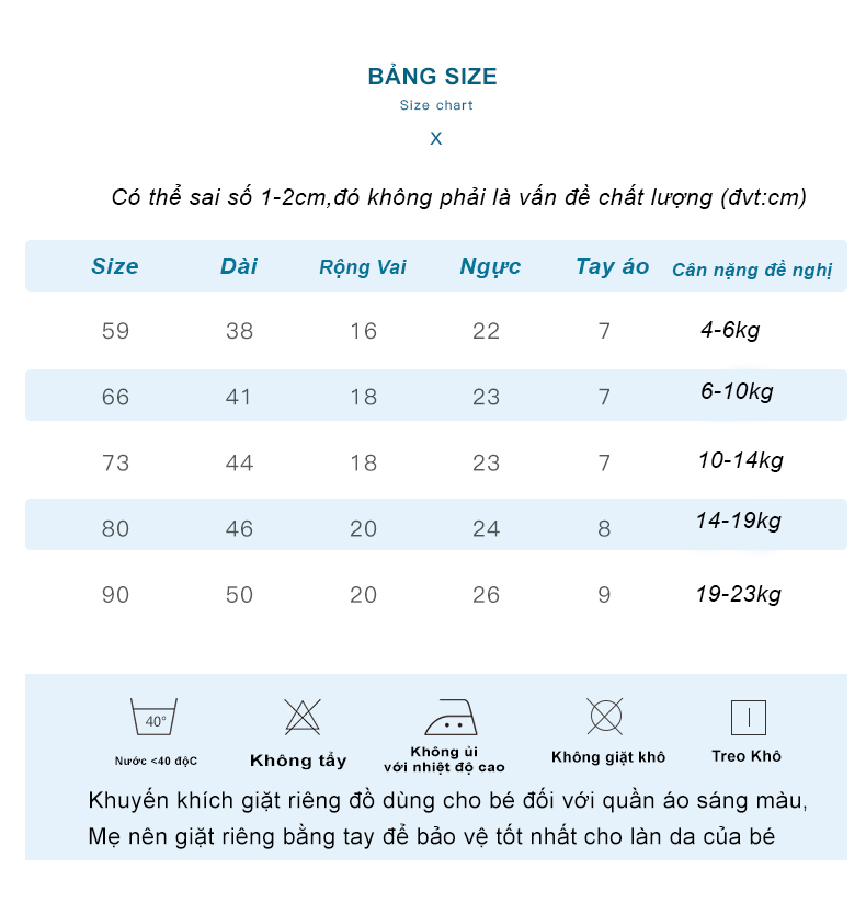 Bảng size tham khảo: - Size 59: 4-6kg (0-3m), cao 52-59cm. - Size 66: 6-8kg (3-6m), cao 59-66cm. - Size 73: 8-10kg (6-9m), cao 66-73cm. - Size 80: 10-12kg (9-12m), cao 73-80cm. - Size 90: