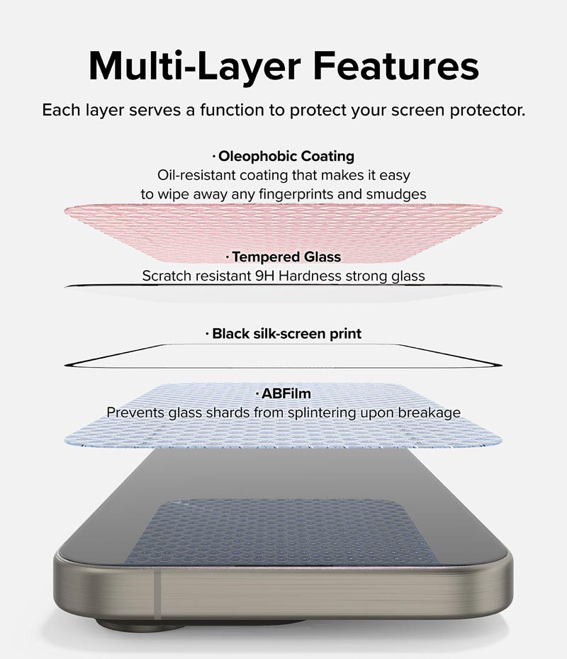 [Combo 2] Dán cường lực kèm khung dán iPhone 15 Pro Max RINGKE Easy Slide Tempered Glass với độ cứng 9H chống trầy xước tốt, cảm ứng nhạy và chính xác, mang lại trải nghiệm chất lượng hình ảnh HD sống động nhờ độ nét cao. Sản phẩm có kèm khung dán giúp bạn dễ dàng thao tác tự dán tại nhà chính xác hơn.
