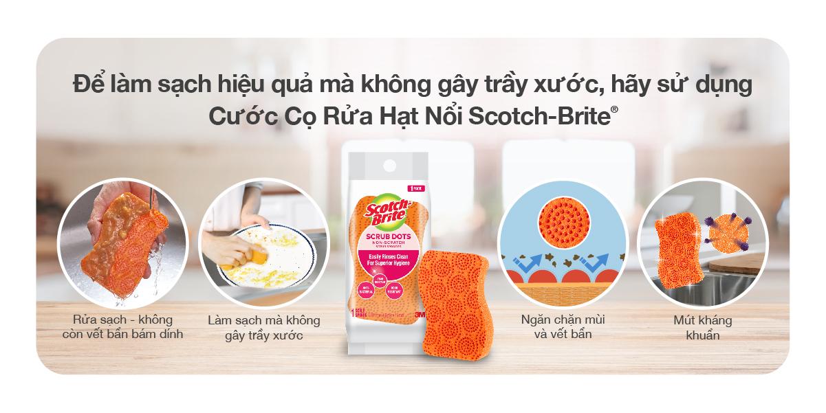 Chà mạnh mẽ - lớp phủ hạt nổi trên bề mặt miếng rửa chén gúp làm sạch các vết bẩn cứng đầu.