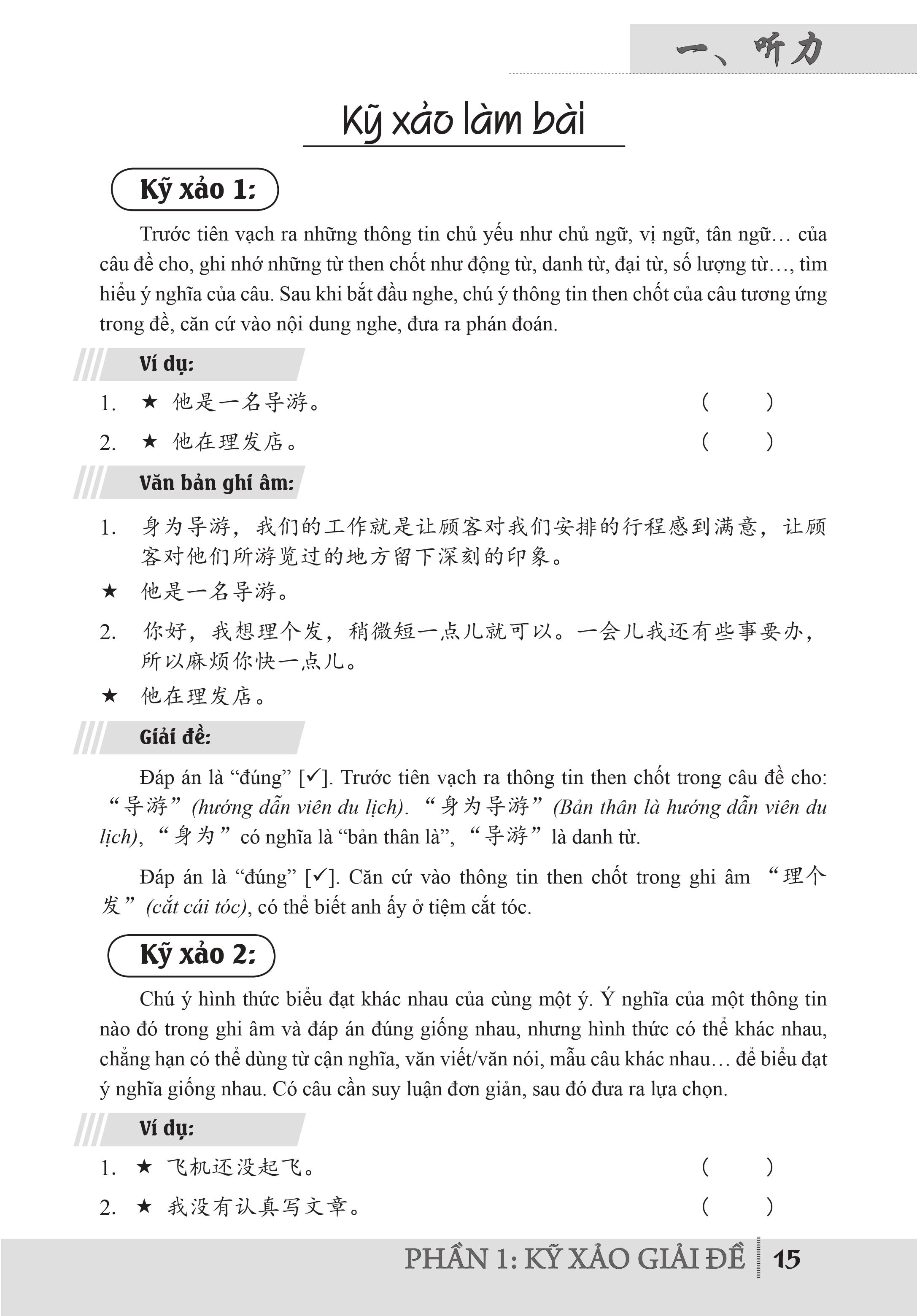 - Phần 3: Thuyết minh đáp án (cung cấp Văn bản ghi âm, Đáp án và Thuyết minh đáp án của 12 đề mô phỏng ở phần 2) Ngoài những đề thi mô phỏng ở phần 2, sách Luyện giải đề HSK cấp 4 còn có hệ thống bài tập thuộc phần 1 (Phần Những kỹ xảo giải đề). Hệ thống bài tập này bao gồm 2 nhóm: nhóm Bài tập kỹ xảo và nhóm Bài tập tính giờ.