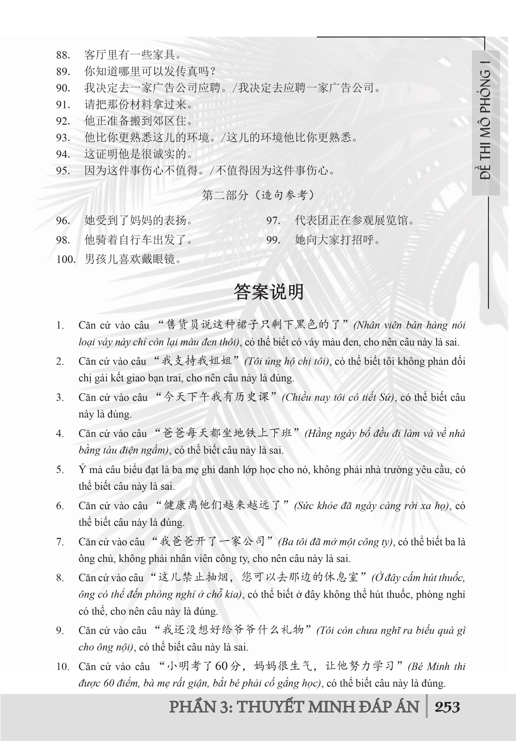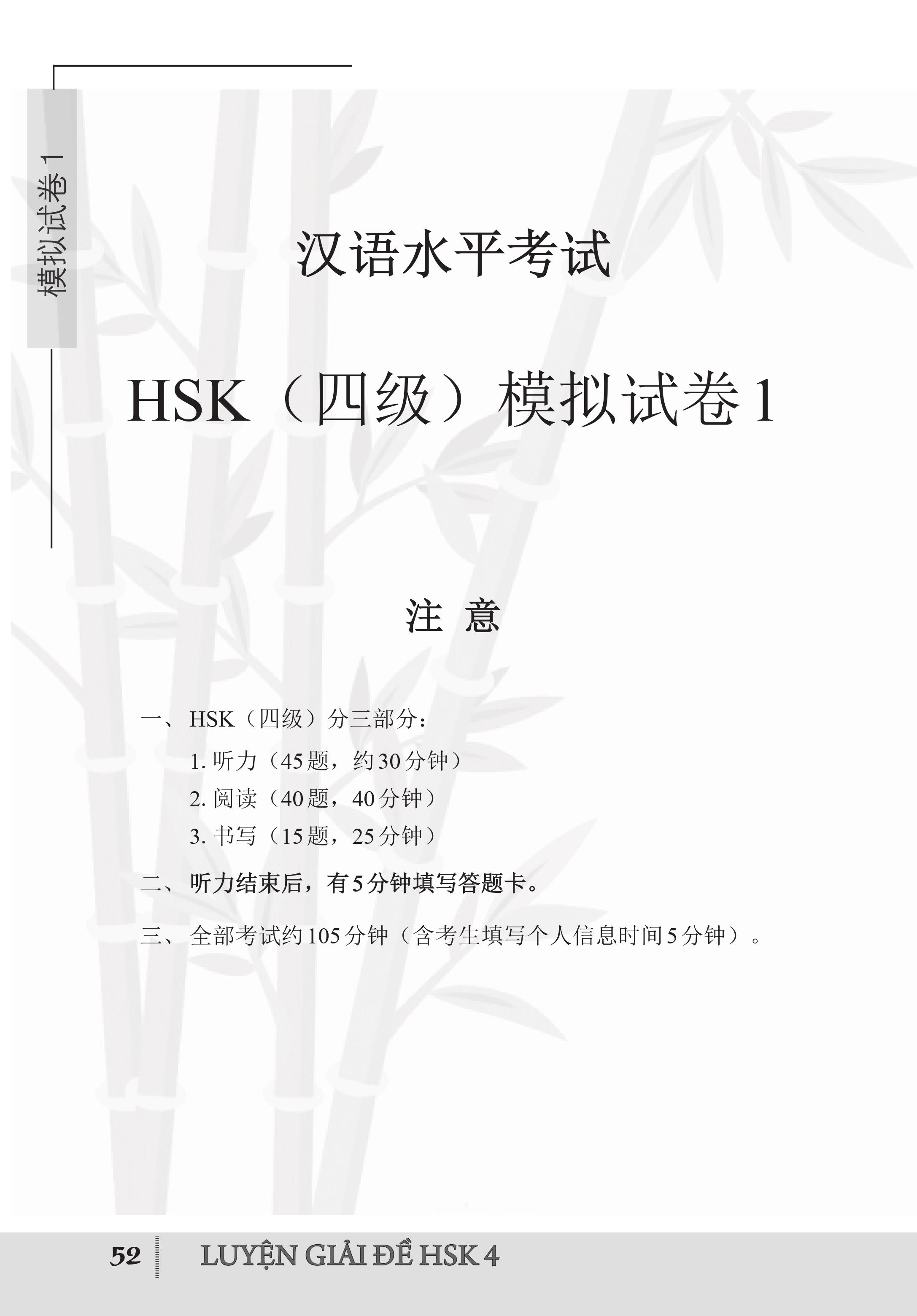 - Phần 2: Đề thi mô phỏng - cung cấp 12 bộ đề thi mô phỏng được biên soạn sát với đề thi thực của kỳ thi HSK cấp 4.