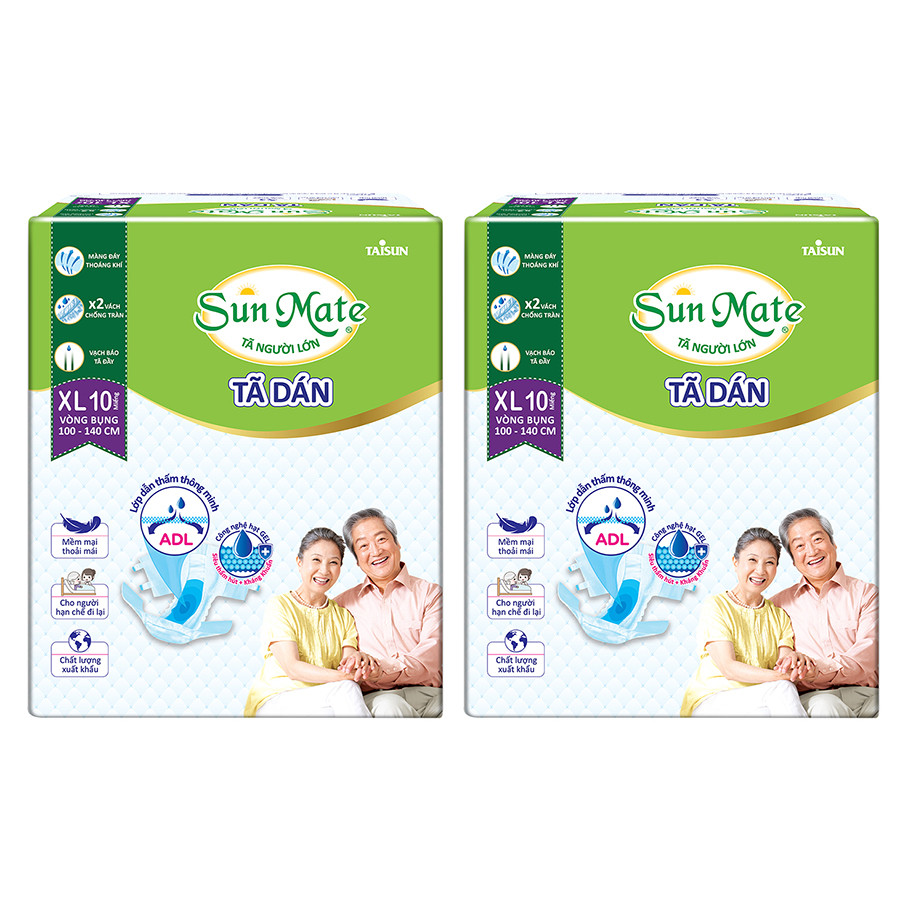 - Tã Dán Người Lớn SunMate Size XL10 (10 Miếng) là sản phẩm đột phá sử dụng chất liệu vải không dệt kết hợp với vách chống tràn giúp ngăn chất lỏng rò rỉ ra hai bên. Bề mặt tã mềm mại có hiển thị ẩm ướt giúp cho việc chăm sóc người cao tuổi được dễ dàng thuận lợi hơn. Giúp người già thoải mái, tự tin vui sống. THÔNG TIN SẢN PHẨM