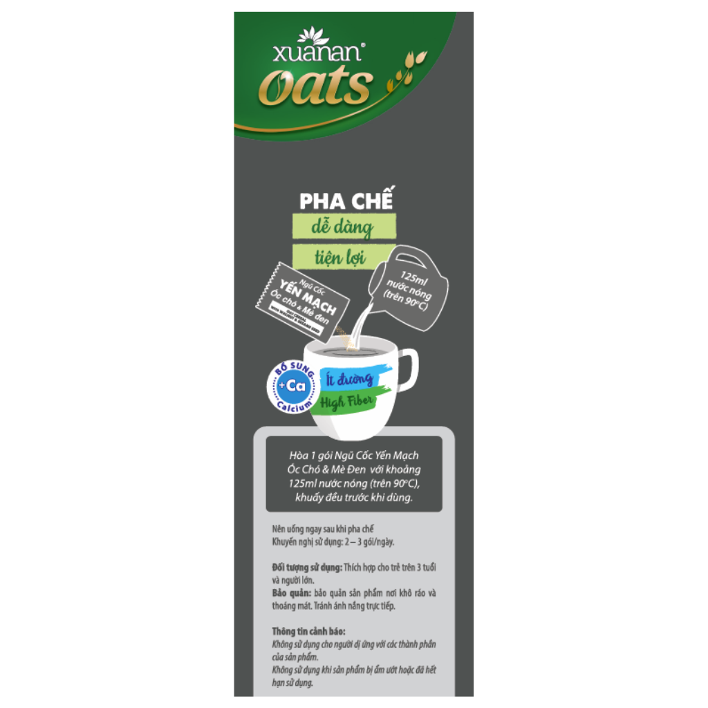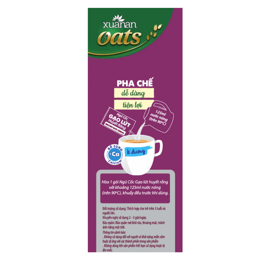 Combo Ngũ Cốc Gạo Lứt Huyết Rồng 400G (25G16 GÓI) + Ngũ Cốc Yến Mạch Óc Chó Và Mè Đen 400G (25G16 GÓI) [ít đường] Ngũ cốc GẠO LỨT Huyet rong là thức uống thơm ngon bổ dưỡng, được làm từ gạo lứt, yến mạch và nhiều loại ngũ cốc. Sản phẩm được bổ sung thêm can xi và sử dụng ít đường. Vitamin, khoáng chất, chất xơ tự nhiên giúp hấp thu dinh dưỡng tốt và thanh lọc cơ thể. Thành phần: Ngũ cốc 32% (gạo lứt huyet rong 10%, yến mạch 6%, gạo lứt, gạo nếp cẩm 3%, bắp, đậu nành, lúa mỳ, lúa mạch), bột kem thực vật 29%, đường, đường ăn kiêng Isomalt, sữa tách béo 7%(Instant Skim Milk Powder &%), bột dừa, Canxi 0.7%, Muối I-ốt, maltodextrin, chất maltodextrin làm dày xanthan gum (E415), chất chống đông vón (E551), hương liệu tổng hợp dùng cho thực phẩm. 6.5 g đường trong khẩu phần 25g Yến Mạch, Óc chó và Mè đen là ba loại hạt được dùng khá phổ biến đối với mỗi gia đình vì chúng có tác dụng rất tốt cho sức khỏe. Đặc biệt, chúng phù hợp sử dụng với nhiều lứa tuổi, ngay cả trẻ nhỏ. Khi kết hợp 3 nguyên liệu này trong chế biến ngũ cốc thì chúng là loại ngũ cốc “Ngũ cốc Yến mạch, Óc chó và Mè đen” siêu hương vị thơm ngon, dinh dưỡng, ngậy béo nhưng không ngấy. Yến mạch chứa đa dạng các dưỡng chất, chất xơ hòa tan, beta-glucan giúp giảm các cholesterol “xấu” (LDL). Các chất này cũng được xem là có đặc tính làm dịu tự nhiên và dễ tiêu hóa. hoạt chất alkaloid gramine có trong Yến mạch là một chất làm dịu tự nhiên, giúp chữa trầm cảm, lo âu và mất ngủ mà không gây tác dụng phụ. Ngủ ngon giấc sẽ khiến bộ não của bạn được phục hồi và làm việc hiệu quả hơn. Ngoài ra, Yến mạch còn chứa nhiều chất xơ hòa tan hơn các loại ngũ cốc khác, nên Yến mạch được tiêu hóa chậm, kéo dài cảm giác no. Nhiều nghiên cứu cho thấy lựa chọn ăn những thực phẩm giúp no lâu có thể làm giảm lượng calo cơ thể tiêu thụ. Trong một bữa ăn bao gồm nhiều thực phẩm giúp no lâu, bạn sẽ giảm được khẩu phần ăn và cảm giác muốn ăn vặt giữa các bữa ăn. Điều này giúp hỗ trợ kiểm soát cân nặng bằng cách cắt giảm bớt lượng calo tổng thể mà bạn tiêu thụ mỗi ngày. Hạt óc chó giàu axít báo alpha-linolenic (ALA), một loại axít béo omega-3. ALA giúp giảm cholesterol (LDL) và giữ cho động mạch khỏe mạnh. Ngoài ra, hạt óc chó còn chứa axít ellagic và tocopherol (phức hợp vitamin E) bao gồm alpha, delta và gamma tocopherol giúp giảm nguy cơ mắc bệnh ung thư, bệnh tim và duy trì sức khỏe làn da, mô. Hạt óc chó cũng chứa serotonin, một hoạt chất giúp giảm căng thẳng. Mè đen là nguồn dồi dào vitamin E, giúp cải thiện tình trạng da, cũng như tăng cường sức khỏe tim mạch và hệ thần kinh. Mè đen cũng chứa các hormone thực vật (như sesamin và sesamolin) giúp giảm huyết áp và bảo vệ gan trước các tổn thương do độc tố gây ra. Hạt mè giàu canxi, cần thiết cho xương và răng. Theo y học cổ truyền, Mè đen có các tác dụng như: Giữ cho da đẹp và tóc lâu bạc, Chữa đầy chướng bụng, Chữa sản phụ thiếu sữa, Chữa viêm mũi mạn tính, Chữa chân tay đau buốt hơi thũng, Chữa táo bón. Đối tượng sử dụng: Trẻ từ 3 tuổi trở lên và người lớn, người ăn theo chế độ giảm đường. Qui cách đóng gói: (25g x 16 gói) 400g/túi- 24 túi/thùng Hướng dẫn sử dụng: Hòa 1 gói Ngũ cốc với khoảng 125ml nước sôi, khuấy đều trước khi dùng. Dùng 2-3 gói mỗi ngày Bảo quản: Bảo quản nơi khô ráo, thoáng mát; tránh tiếp xúc trực tiếp với không khí và ánh nắng mặt trời. Thông tin cảnh báo: Không dùng khi sản phẩm bị rách, mốc hoặc đã hết hạn sử dụng. Sản phẩm của: Công ty TNHH Thực Phẩm Dinh Dưỡng Xuân An