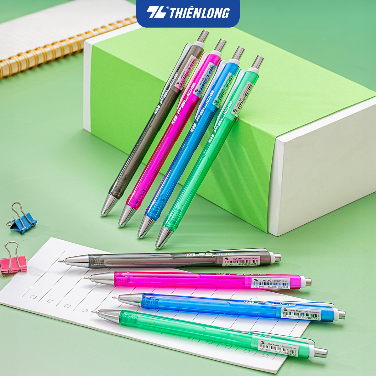 Thông số kĩ thuật : Tên danh mục Bút Gel Thương hiệu Thiên Long Đường kính viên bi 0.5 mm Màu mực Đen / đỏ / tím / xanh Trọng lượng 10 gram Tính năng