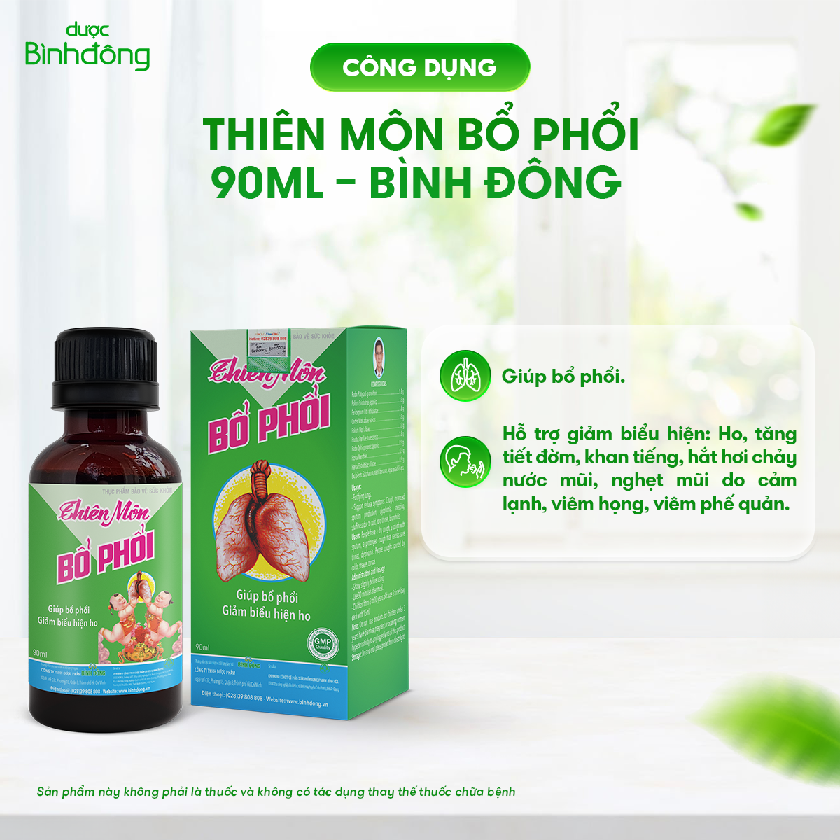 Mua tại TiktokThiên Môn Bổ Phổi của Dược Bình Đông – Chai 90ml dành cho Trẻ em - Bổ phổi, tăng cường sức đề kháng, giảm ho cho trẻ ✓ Trẻ nhỏ là đối tượng dễ bị tác động từ môi trường dễ sinh cảm ho, viêm họng, viêm phế quản. ✓ Vì vậy, Thiên Môn Bổ Phổi Trẻ Em chính là giải pháp giúp mẹ bảo vệ trẻ hữu hiệu. ✓ Thiên Môn Bổ Phổi Trẻ Em chiết xuất từ 100% thảo dược thiên nhiên, là thực phẩm bảo vệ sức khỏe mang lại tác dụng tốt trong việc: