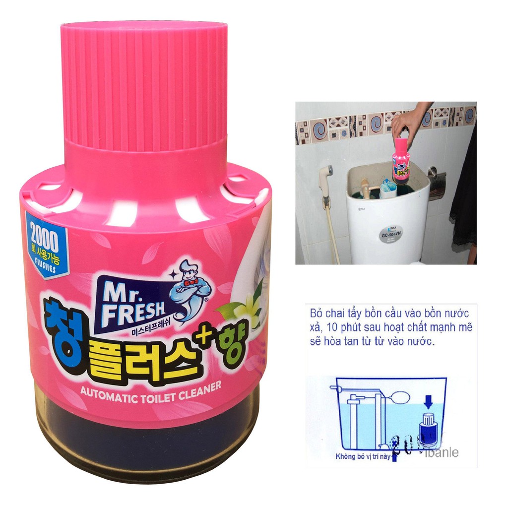 THÔNG TIN SẢN PHẨM Tên sản phẩm : Chai thả bồn cầu tự động làm sạch diệt khuẩn và làm thơm Mr.Fresh Công dụng : Giữ cho bồn cầu sạch sẽ mà không cần phải