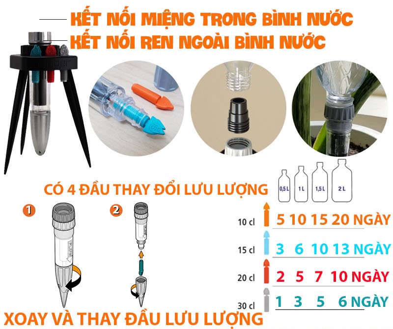 - Có 4 loại đầu tưới: 10 cl, 15 cl, 20 cl, 30 cl / ngày, bạn có thể tùy vào loại cây đang trồng để lựa chọn đầu tưới thích hợp. Các đầu tưới này sẽ hoạt động với lưu lượng chính xác như trên. Đảm bảo cây của bạn được tưới đều mỗi ngày. Bạn chỉ cần giữ cho luôn có nước trong chai. Lưu ý: Hãy lưu ý rằng, đầu tưới Idris được sản xuất để khớp với các chai nước thông dụng theo chuẩn quốc tế. Idris có 2 loại ren: màu đen khớp với các chai nước chuẩn châu Âu và màu xám khớp với chuẩn châu Á khi sử dụng bạn nên cất ren màu đen đi .