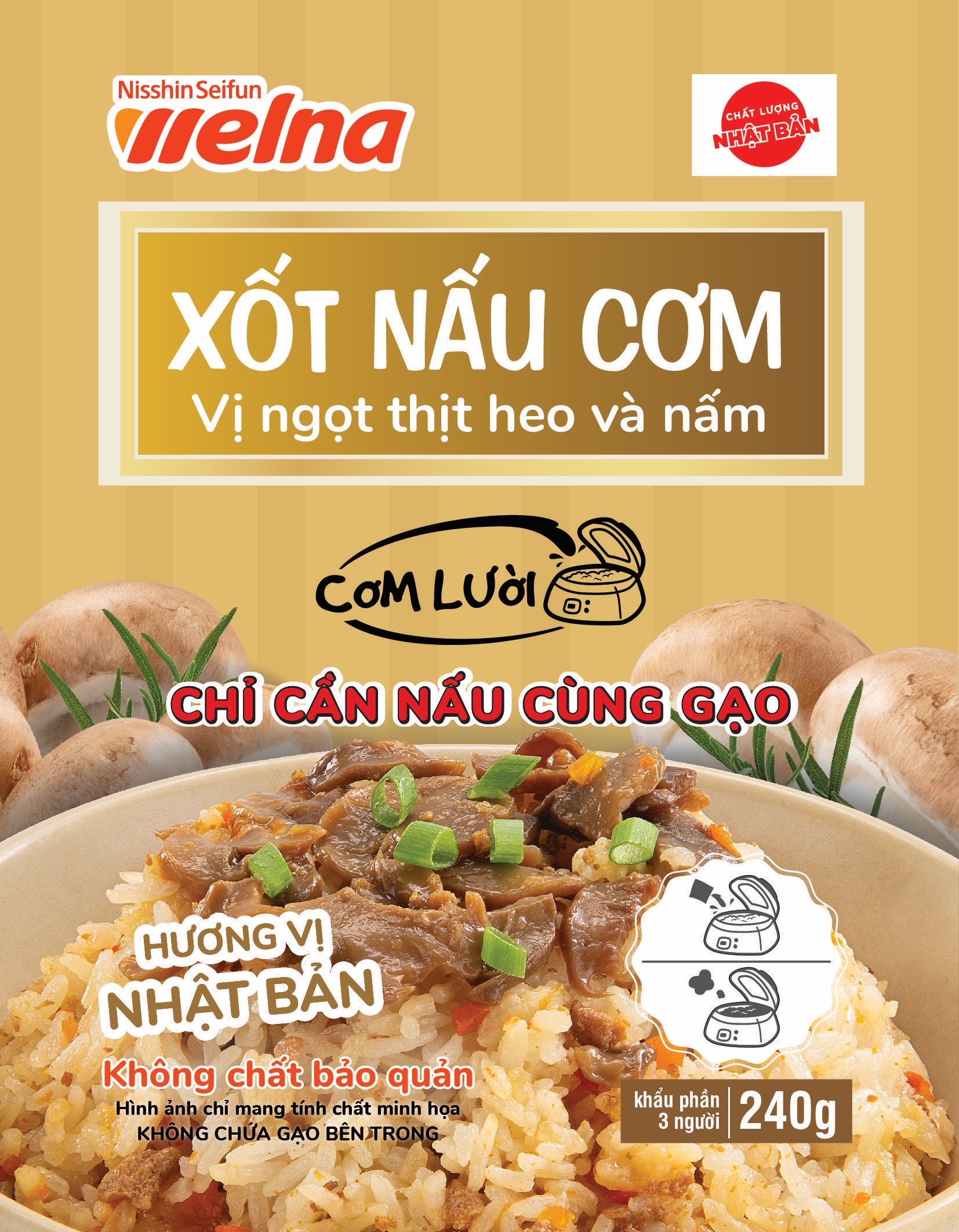 Với nguyên liệu là thịt heo xay và nấm, được chế biến theo quy trình khép kín, bảo toàn được nhiều tinh hoa, dinh dưỡng từ nguyên liệu. Bạn sẽ cảm nhận được hương vị đậm đà phong cách Nhật Bản.