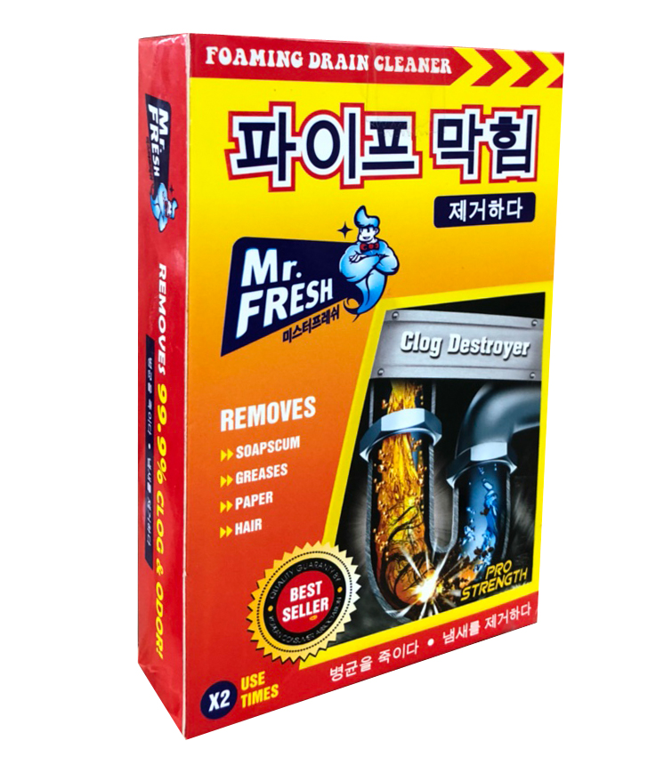 Thông Tin Sản Phẩm Tên Sản Phẩm : Hộp bột thông cống Mr Fresh Hàn Quốc 200gCông dụng : Thông tắc ống cống , ống thoát nước.Thành phần : Sodiumhydrochlorite, sdiumhydroxide, sodium silicate, hidrotrope, blodegradeble surfactant 99%Hướng dẫn sử dụng : - Cắt chéo miệng túi, đổ hạt bột vào xô nhựa, hòa tan với khoảng nửa lít nước, đổ dung dịch vào cổ ống nơi bị tắc nghẽnĐể từ 1 – 3 giờ rồi xả mạnh nước cho chảy đi (tốt nhất là đổ buổi tối, để tới sáng hôm sau mới xả mạnh nước hoặc dùng thụt cao su thụt cho chảy đi).Kích thước : 14,6 x 9,7 x 3,2 cmTrọng lượng : 200gHình thức đóng gói : 2 gói 100g/hộpMàu sắc : Hộp Đỏ (gói bên trong màu bạc)Xuất xứ : Mr Fresh - Hàn Quốc Bột thông tắc đường ống thoát nước Mr.Fresh Hàn Quốc là một trong những sản phẩm tốt nhất được bán chạy ở Hàn Quốc với công thức tiên tiến, các thành phần hóa học chuyên dụng, độ tẩy cực mạnh sẽ xoáy tan mọi cặn bẩn trong đường ống một cách hiệu quả.Sản phẩm sẽ thông sạch mọi loại cặn bẩn như giấy, rác, rau, mỡ, thịt, gạo, tóc… kẹt trong đường ống thoát nước của chậu rửa nhà bếp, lavabo, bồn tắm… mà không làm hư hại đường ống và các thiết bị vệ sinh.Bột thông tắc đường ống thoát nước Mr.Fresh Hàn Quốc trong thành phần của nó luôn có các hỗn hợp hóa học có độ kiềm, độ ăn mòn, độ phân hủy cực cao, giúp phân hủy các hợp chất hữu cơ, chất cặn bã có trong đường ống gây tắc nghẽn. ƯU ĐIỂM NỔI BẬT CỦA BỘT THÔNG TẮC VỆ SINH THÔNG CỐNG HÀN QUỐC MR.FRESH : – Sử dụng dễ dàng– Xóa bỏ sự lo lắng tắc đường ống cống, tắc bể phốt.– Nhanh chóng và tiện lợi cho việc chăm sóc gia đình.– Phân hủy và làm mềm các chất hữu cơ gây tác nghẽn đường ống như: rêu, rác, thức ăn thừa, mỡ, cọng rau, tóc và các xác động vật– Công thức tẩy sạch vết bẩn cứng đầu nhanh chóng– Không để lại mùi khó chịu như các sản phẩm thông thường– Giúp bồn cầu và ống dẫn nước thải luôn sạch sẽ, vệ sinh HƯỚNG DẪN CÁCH SỬ DỤNG Bột thông tắc đường ống thoát nước Mr.Fresh Hàn Quốc Cắt chéo miệng túi, đổ hạt bột vào xô nhựa, hòa tan với khoảng nửa lít nước, đổ dung dịch vào cổ ống nơi bị tắc nghẽnĐể từ 1 – 3 giờ rồi xả mạnh nước cho chảy đi (tốt nhất là đổ buổi tối, để tới sáng hôm sau mới xả mạnh nước hoặc dùng thụt cao su thụt cho chảy đi)Bột thông tắc đường ống thoát nước Mr.Fresh Hàn Quốc đã và đang được sử dụng nhiều ở những đơn vị lớn như khách sạn , nhà hàng..