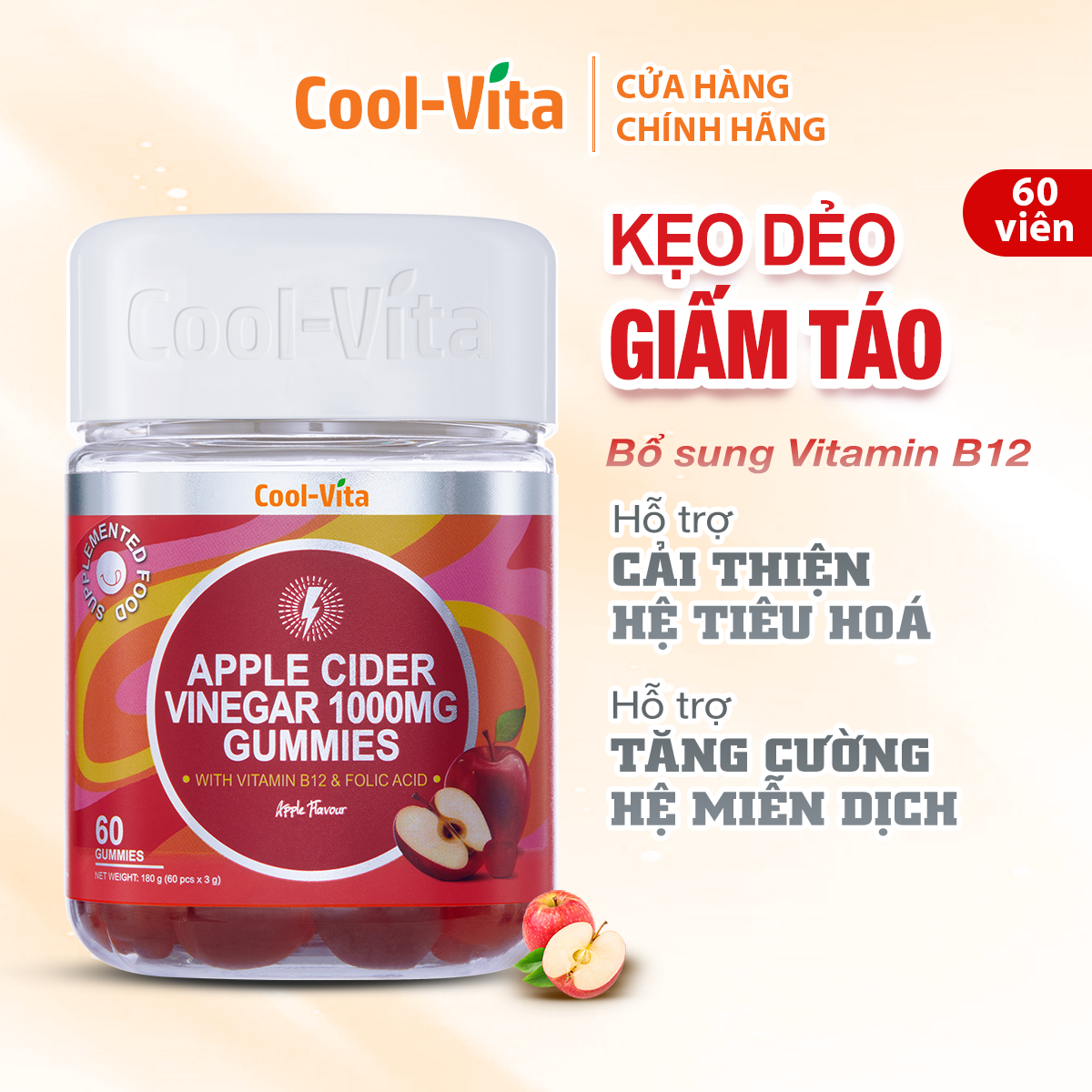 Kẹo dẻo giấm táo giúp bổ sung thêm Vitamin B12 & Axit Folic là một giải pháp bổ sung dinh dưỡng tiện lợi, hỗ trợ bạn cải thiện sức khỏe tiêu hóa, tăng cường hệ miễn dịch. Mỗi 2 viên kẹo dẻo chứa 1000mg giấm táo nguyên chất, kết hợp với các dưỡng chất quan trọng như Vitamin B12, Vitamin B6 và Axit Folic, mang lại hiệu quả tuyệt vời cho sức khỏe. Nếu bạn đang mong muốn cải thiện sức khỏe từ bên trong thì đừng nên bỏ qua sản phẩm Kẹo Dẻo Giấm Táo của CoolVita nhé!